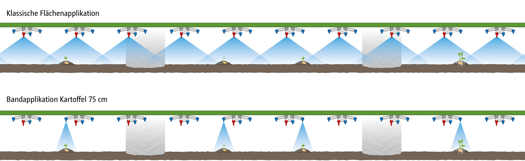 In Kombination mit AmaSelect Row und AmaSelect Spot ergeben sich weitere Vorteile des 25-cm-Düsenabstands. Die Bandapplikation ist besonders im Kartoffelbau mit einem Reihenabstand von 75 cm verbreitet. AmaSelect Row schaltet dann beispielsweise nur jede dritte Düse des Verlagerungssatzes ein, um nur die Reihe zu behandeln.