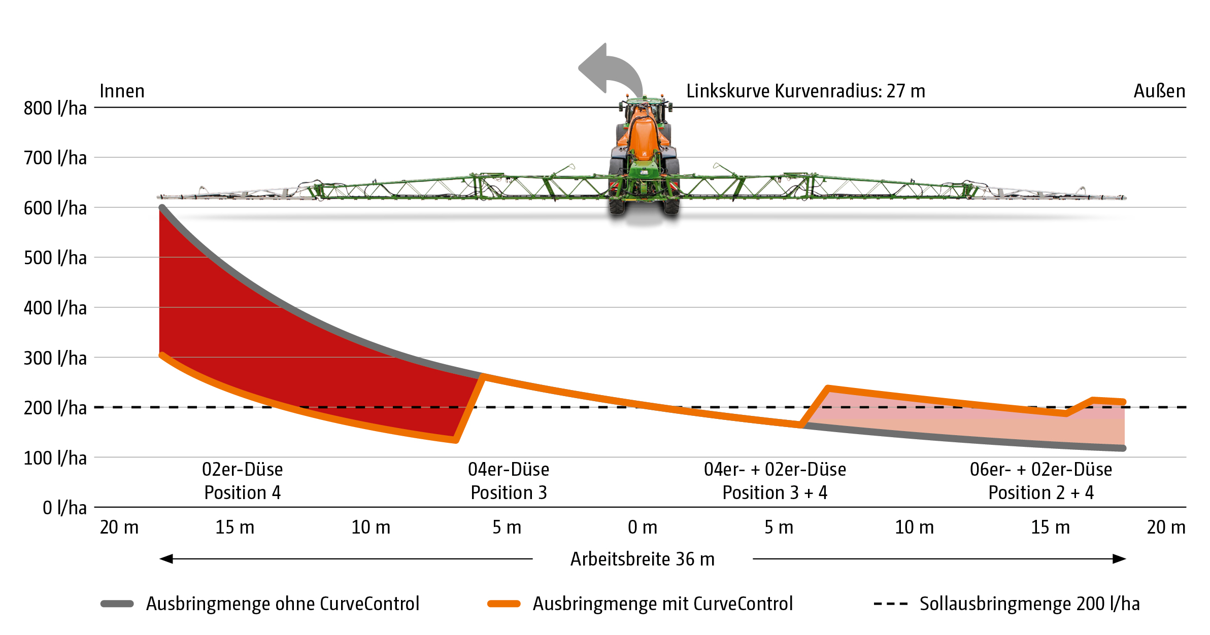 In Kurvenbereichen besteht die Problematik, dass auf der Innenseite überdosiert und auf der Außenseite unterdosiert wird. Es drohen Kulturschäden auf der Innenseite sowie Verunkrautung und Resistenzen auf der Außenseite.