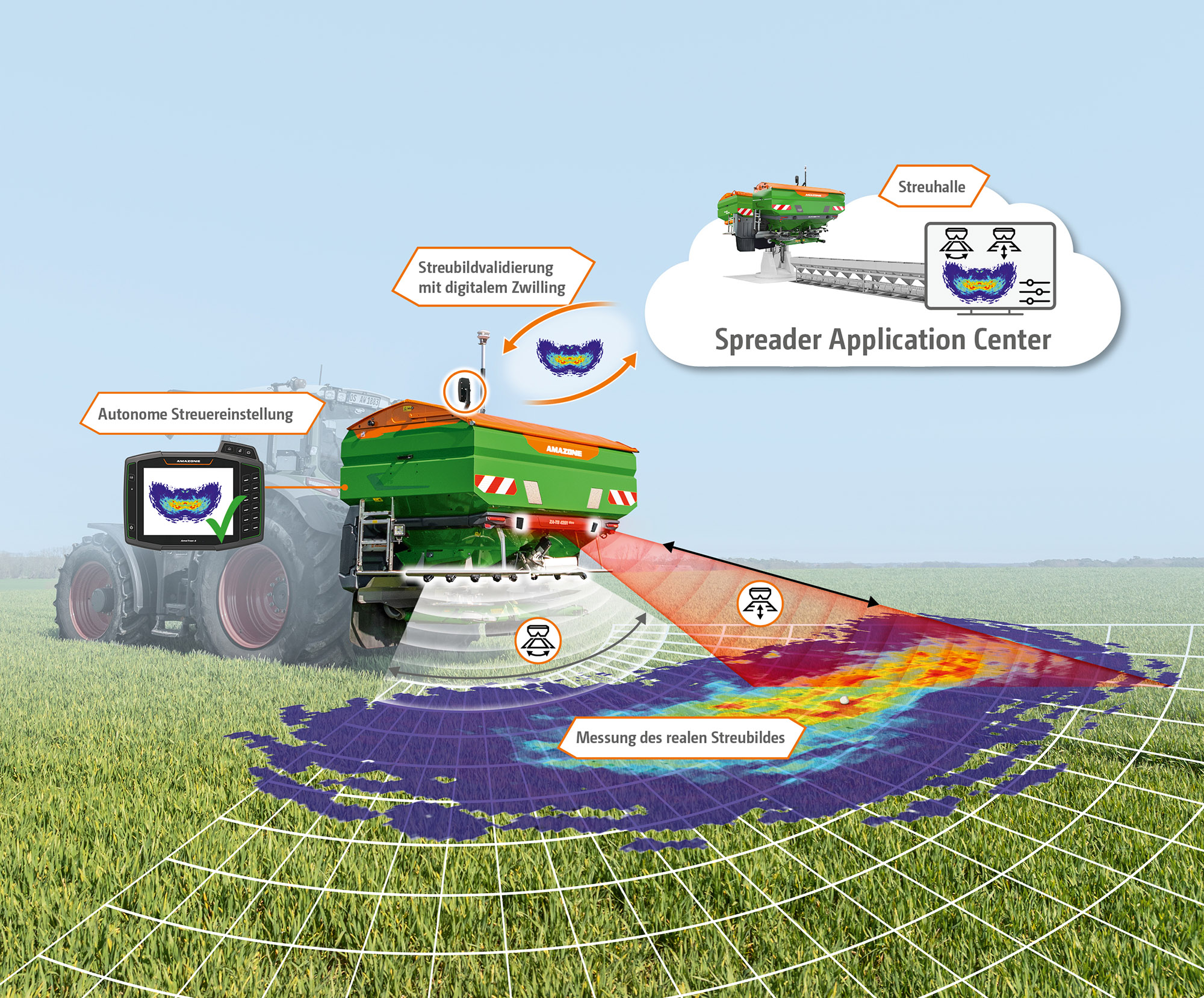 AutoSpread sorgt nicht nur für höchste Präzision, sondern auch Prozesssicherheit sowie eine intelligente Überwachung der Querverteilung. Während eine Prüfung der Streuqualität bisher nur punktuell mit manuellen Prüfständen im Feld möglich ist, ermöglicht AutoSpread eine kontinuierliche Validierung des realen Streubilds. Durch die Onlineanbindung über die AmaConnect Unit an die AMAZONE Streuhalle (SAC) wird der digitale Zwilling automatisch auf den Streuer im Feld übertragen. Die real gemessenen Daten werden nun mithilfe eines AI-unterstützten Algorithmus mit den bekannten Streubildern des digitalen Zwillings abgeglichen und permanent in Echtzeit validiert. Fehlerhafte Düngereinstellungen werden zuverlässig detektiert und das Streubild wird perfekt eingeregelt. Durch die intelligente Anbindung ist dies bei einem Netzausfall auch offline möglich, Empfangsprobleme auf dem Feld stellen somit kein Problem dar.
