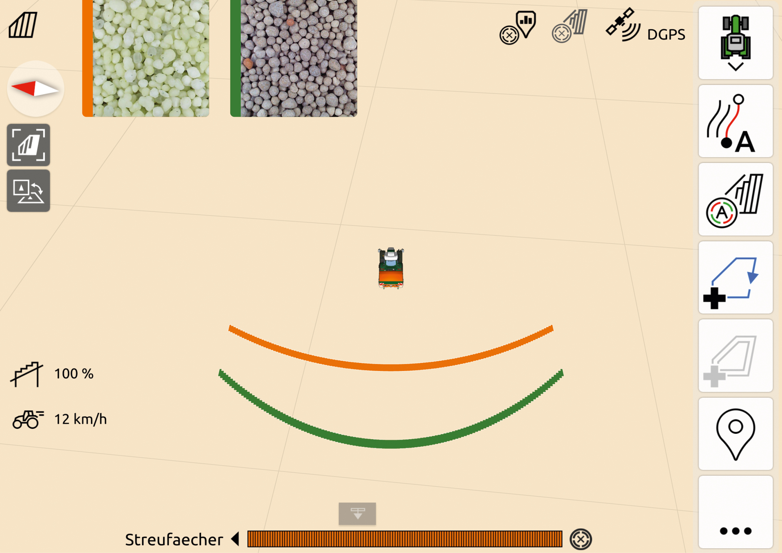 Neben der Optimierung der Düngerverteilung ist auch die grafische Darstellung in der GPS-Ansicht von Bedeutung. In Verbindung mit dem AmaTron 4 wird die Schwenkbewegung zuverlässig aufgezeichnet, was zu einer gleichmäßigen Kartenbedeckung führt. Ungewollte weiße Flecken gehören damit der Vergangenheit an. Das hat eine zuverlässigere Arbeit des Section Control zur Folge. Das ungewollte Öffnen der Dosierschieber wird verhindert.