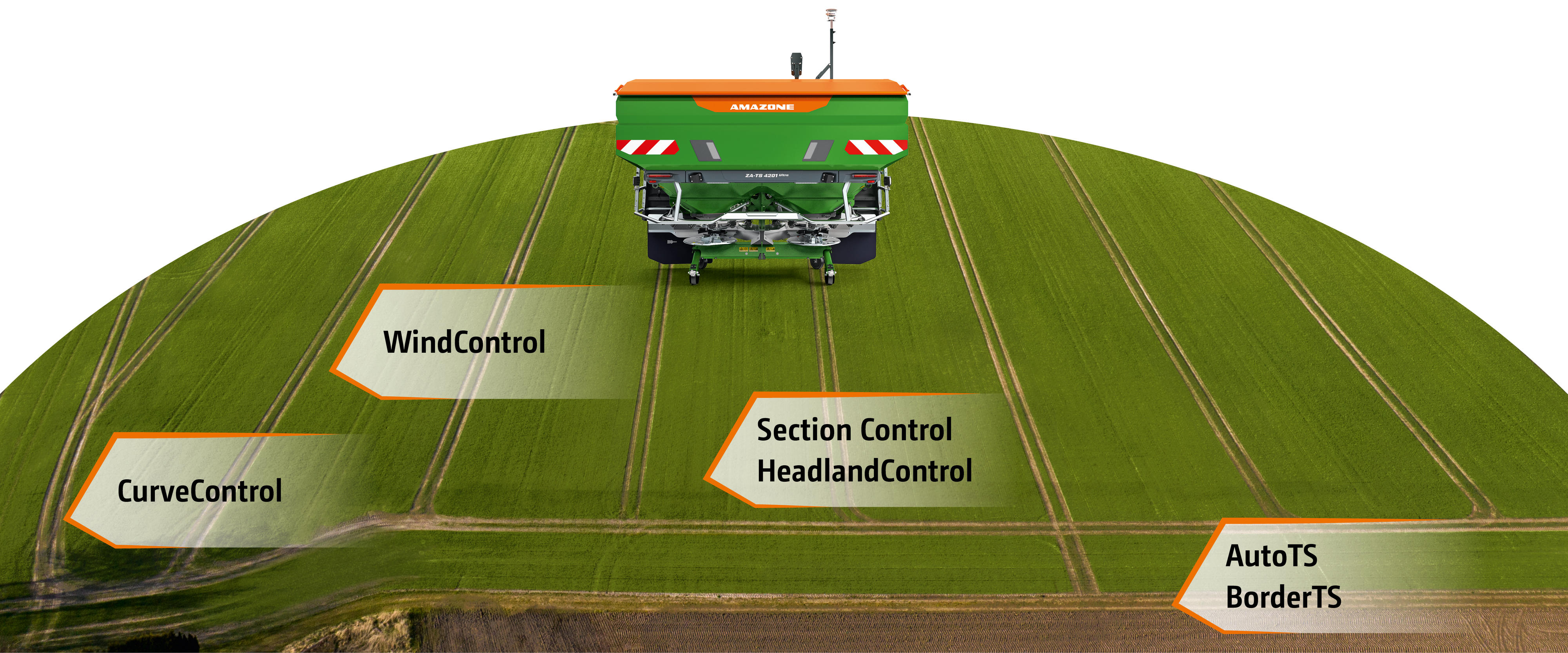 Durch die zusätzlichen Sensoren von AutoSpread können nun erstmals neben der Wurfrichtung auch die Wurfweite und somit das tatsächliche Streubild auf dem Feld ermittelt werden. Das macht den ZA-TS 01 AutoSpread zur mobilen Streuhalle. Während die innovativen Lösungen für die verschiedenen Einzelsituationen wie HeadlandControl, WindControl (nach Prof. Dr. Karl Wild, HTW Dresden) oder Section Control bislang Einzellösungen waren, werden nun erstmals all diese Systeme ganzheitlich von AutoSpread optimiert. So ermittelt AutoSpread im Fall von Section Control automatisch die realen Einschaltpunkte und Ausschaltpunkte oder passt die Regelung über den Windsensor WindControl für den aktuellen Dünger an. Im Zusammenspiel mit dem neuen Grenzstreuen wird auch im Randbereich die Verteilung optimiert. Mit AutoSpread werden alle Systeme so genau wie nie zuvor und alle Flächen im Feld bestmöglich gedüngt.