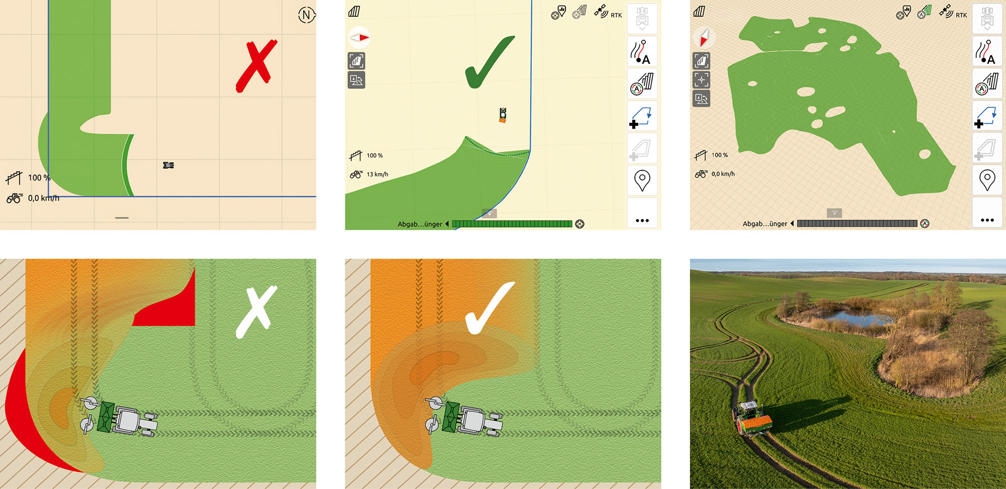 Optimale Düngerverteilung in Kurven: Neben der Optimierung der Düngerverteilung wird, in Verbindung mit dem AmaTron 4, auch eine gleichmäßige Kartenbedeckung sichergestellt.