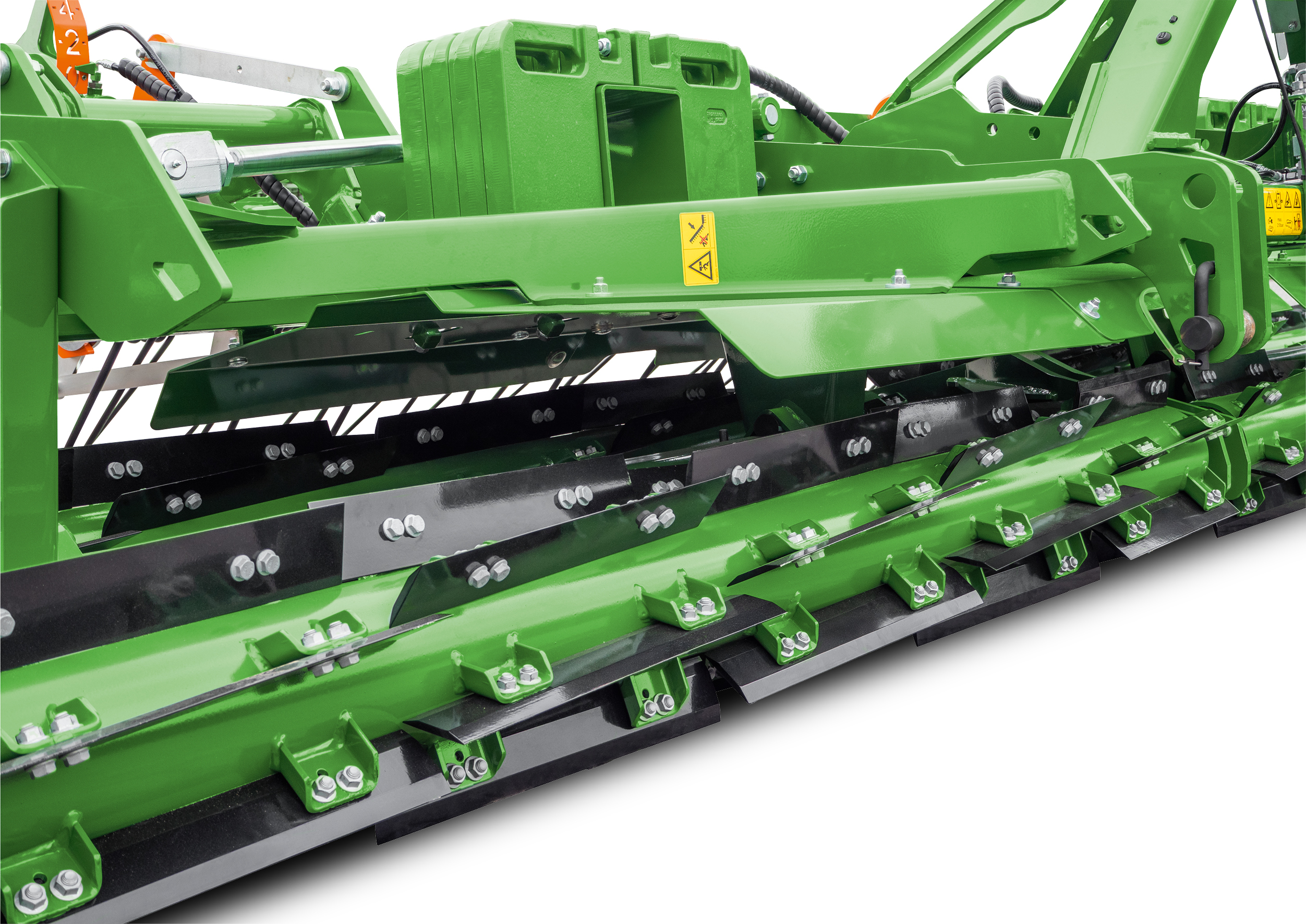 Um diesen steigenden Ansprüchen im Ackerbau gerecht zu werden stellt AMAZONE nach dem angehängten TopCut 12000-2T nun die angebauten TopCut 5000-2 und 6000-2 in den Arbeitsbreiten 5 m und 6 m vor. Die Anbaumaschine besteht aus dem Hauptwerkzeug mit 2 hintereinander laufenden Messerwalzen und kann optional zusätzlich mit einem dreireihigen Striegel ausgerüstet werden. Die aus den Scheibeneggen bekannten Messerwalzen eignen sich für die intensive Zerkleinerung von langen Pflanzenresten wie Rapsstängeln, Sonnenblumenstängeln oder Zwischenfrüchten. Die Messerwalzen zerschneiden und fasern die Pflanzenreste intensiv auf, wodurch der Rotteprozess deutlich beschleunigt wird. Zusätzlich erzeugen die Messerwalzen trotz der oberflächigen Bearbeitung von 0 – 2 cm genügend Feinerde für ein optimales Saatbett, um Unkrautsamen und Ausfallgetreide zum Keimen zu bringen. Darüber hinaus lässt sich die Doppelmesserwalze auch zur Saatbettbereitung und Scheinsaatbett-Bereitung einsetzen. Durch die hohe Umfangsgeschwindigkeit kommt es so zu einem sehr guten Krümelungseffekt.