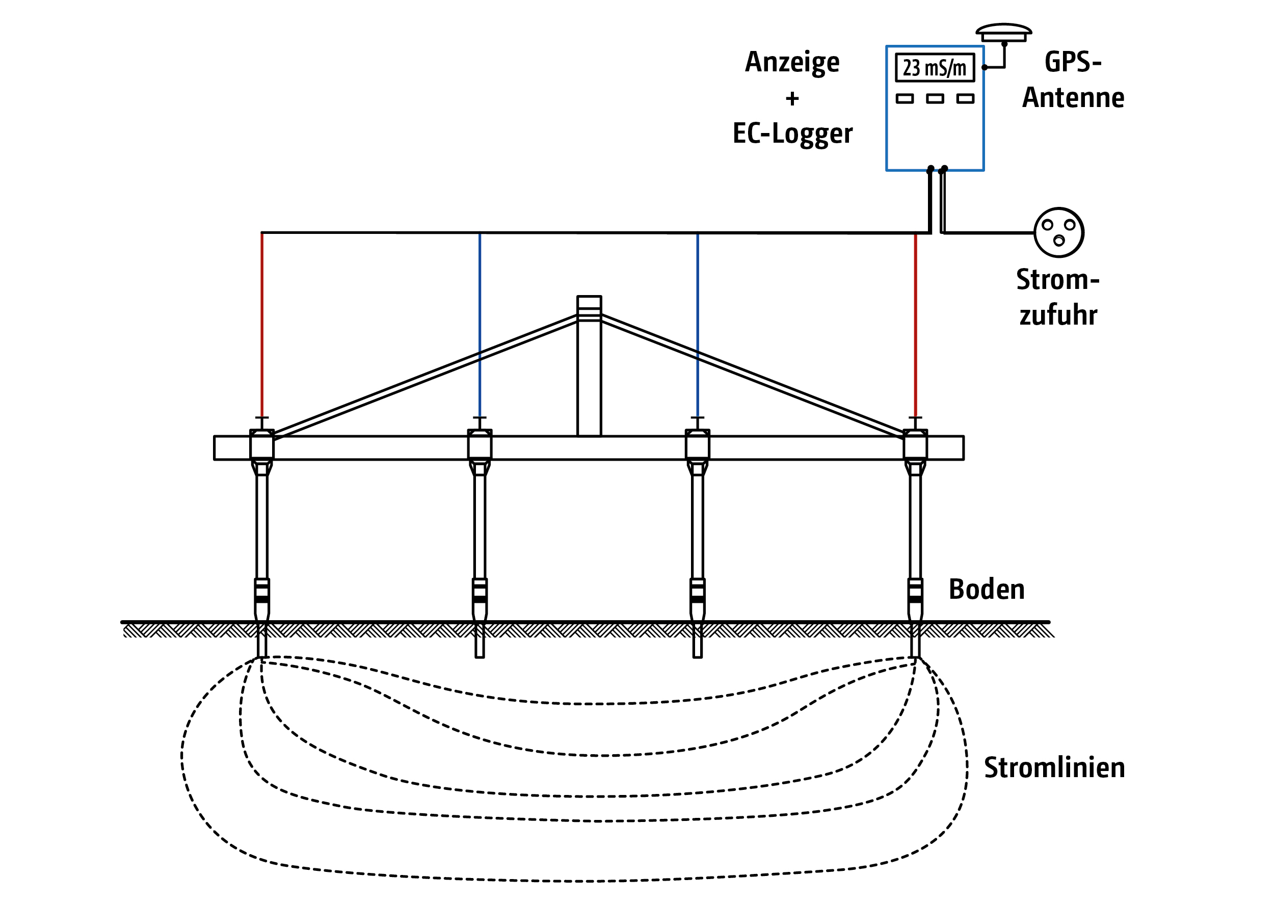 Der Messstrom (I) ist konstant. Gemessen wird die Messspannung (U). Änderungen in der Messspannung zeigt eine Änderung in der Bodenleitfähigkeit an.