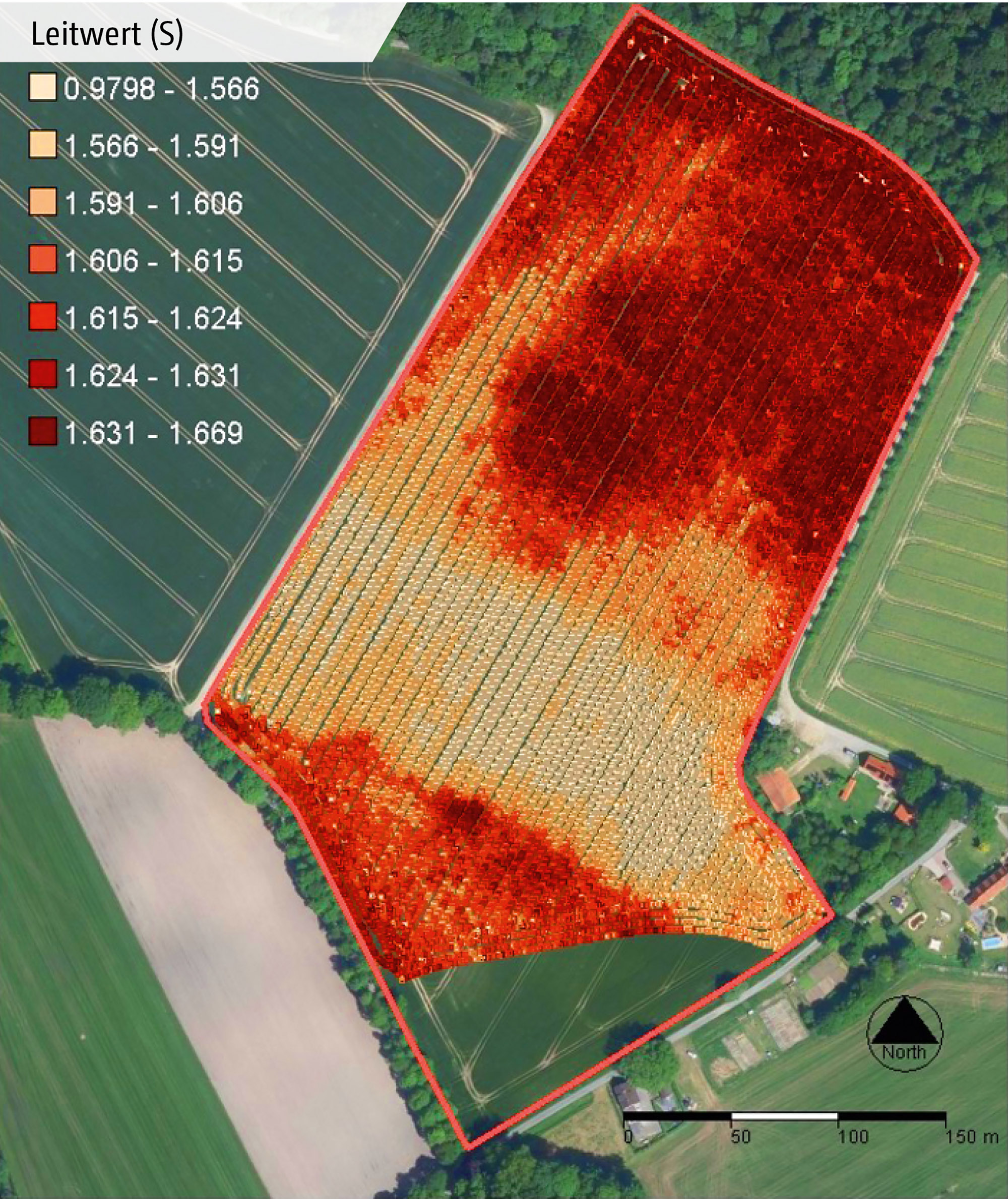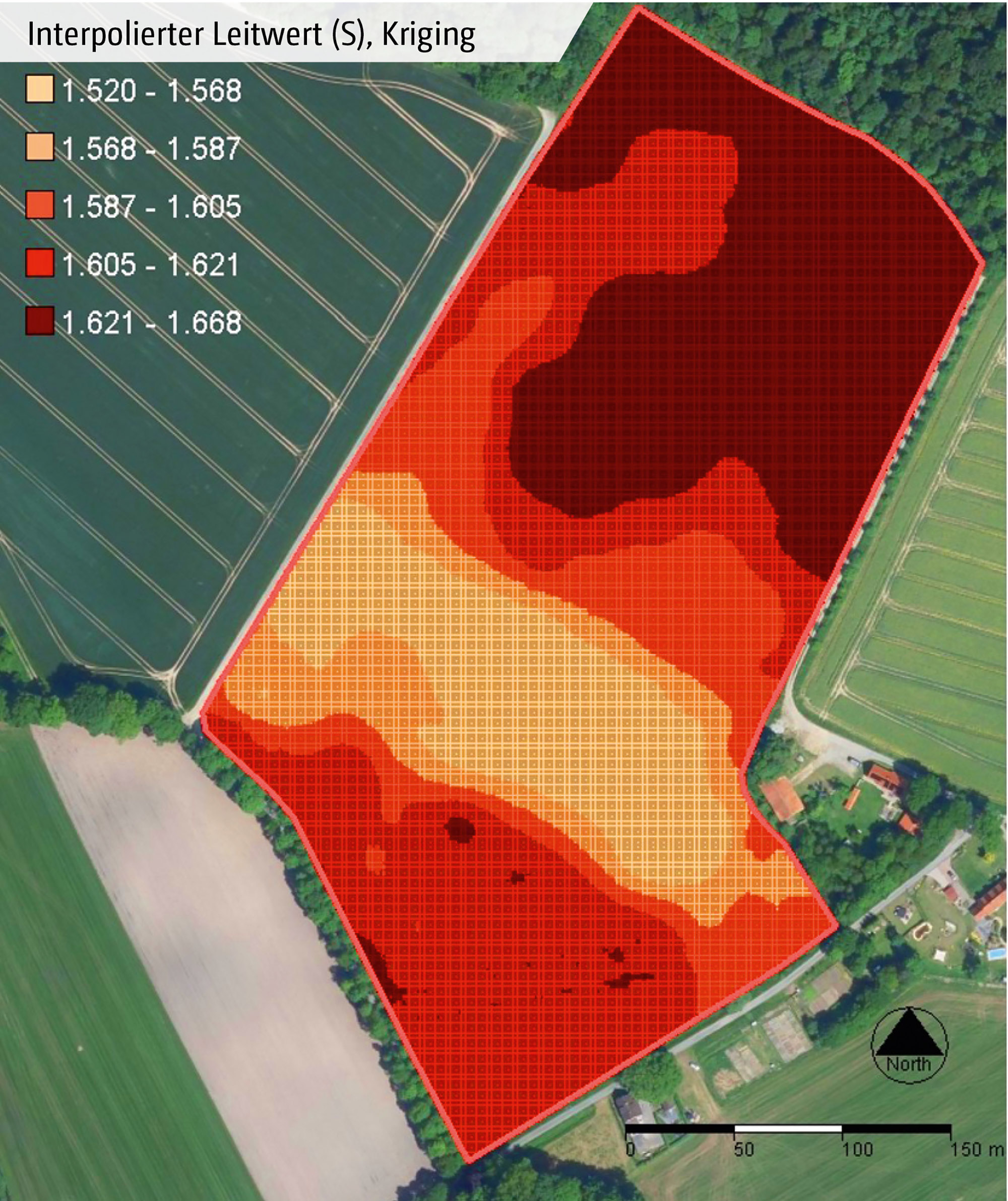 Nach einer Messdatenaufbereitung und Kriging (Interpolation der Leitwerte) entstehen interpolierte Werte der elektrischen Leitfähigkeit (EC-Werte), die nach der Jenks-Methode klassifizert werden.