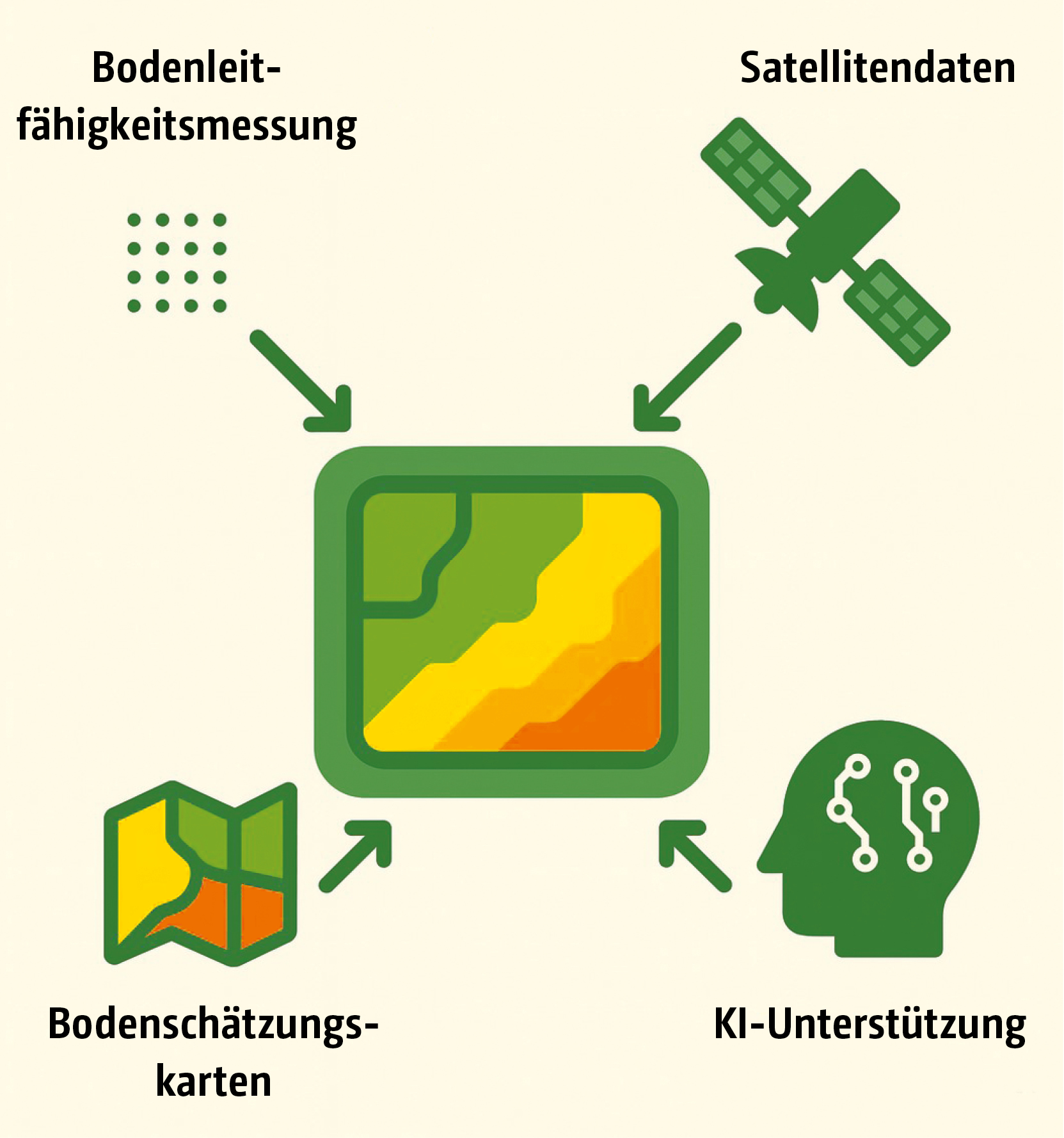 Im nachfolgenden Prozessschritt erfolgt die Datenfusion aus den interpolierten Leitfähigkeitswerten, Satellitendaten und Bodenschätzungsdaten der jeweiligen Landesämter.