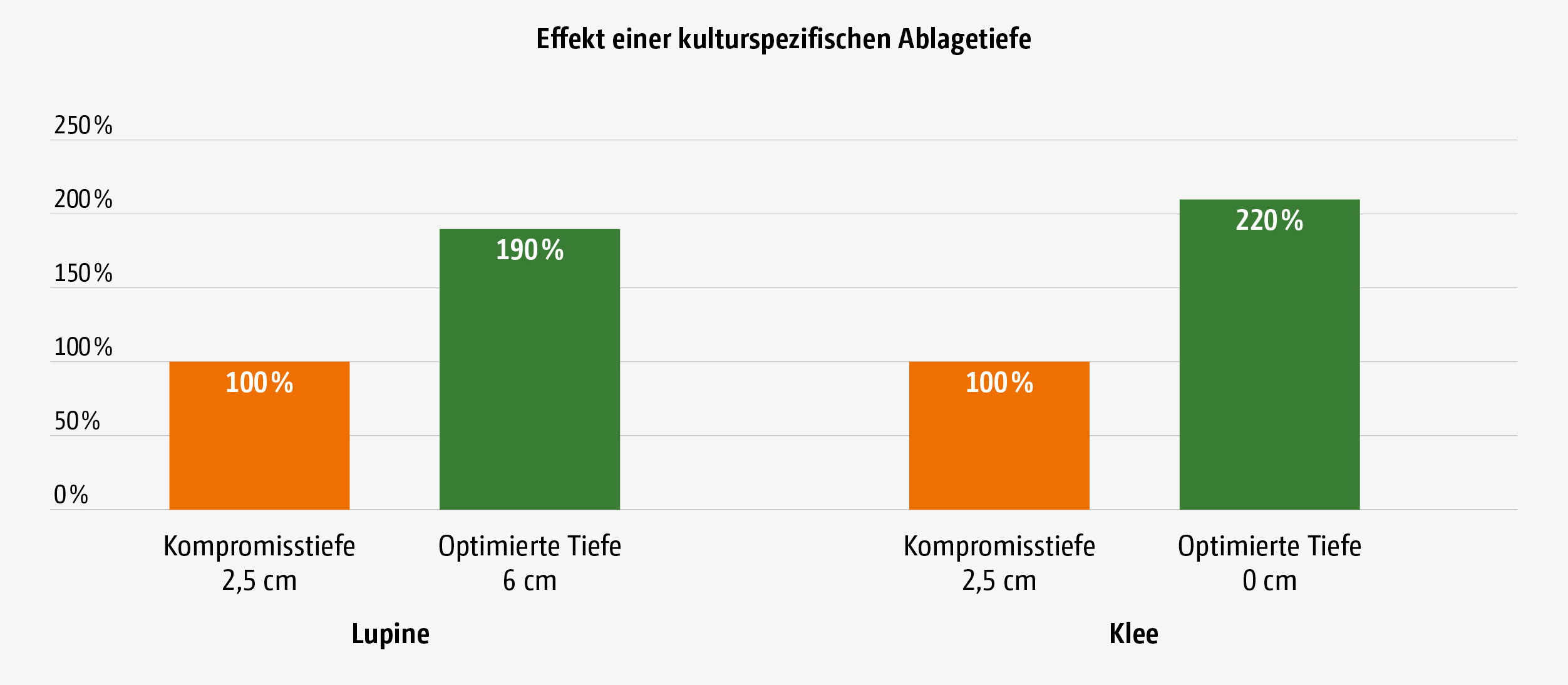 Es wurden intensive Feldversuche durchgeführt, um zu verdeutlichen, wie wichtig eine präzise und kulturspezifische Ablagetiefe ist. Im folgenden Diagramm ist dargestellt, inwieweit durch die präzise Ablage, Feldaufgänge gesteigert werden können. Die Ergebnisse zeigen das enorme Potential dieser Technik: Das teure Saatgut erreicht deutlich höhere Feldaufgänge, wenn es ideal abgelegt wurde.