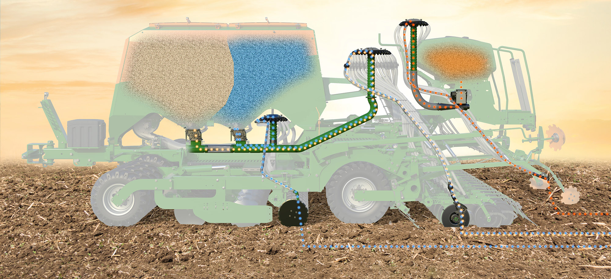 Kombinierte Volumensaat und Einzelkornsaat mit 4 Abgabepunkten