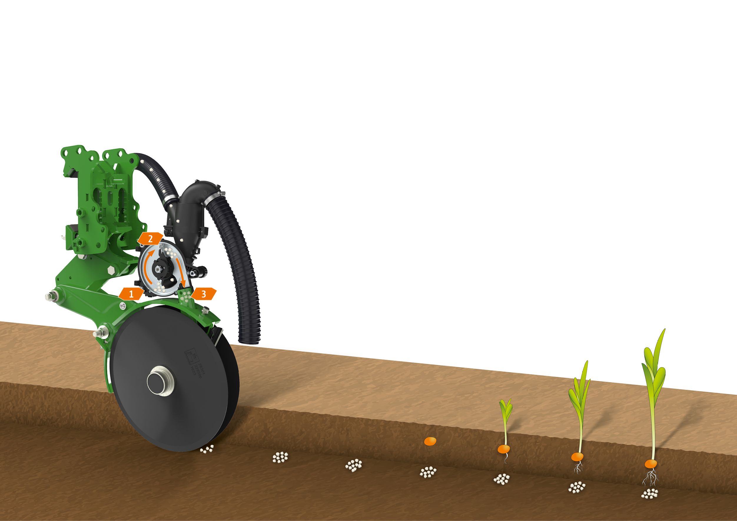 - Die Düngerportion wird über den Auslass der Portionierkammer über die Schussstrecke exakt in den Boden platziert, synchron zu der Ablage des Saatgutkorns.