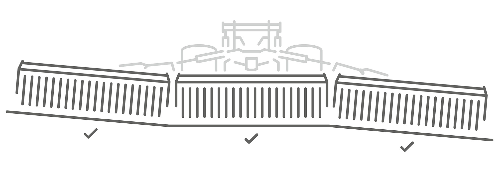 Das ContourFrame ermöglicht eine individuelle Anpassung der einzelnen Segmente in hügeligem Gelände. Dank der neuen, 5-teiligen Aufteilung der Segmente, wird eine noch bessere Geländeanpassung erreicht. Die Segmente können sich nach oben und unten anpassen, wodurch eine ganzflächige Bearbeitung auch in sehr welligen Geländekontouren ermöglicht wird. Die über Hydraulikspeicher vorgespannten Segmente verrichten eine gleichmäßige Arbeit und werden aktiv mit Druck beaufschlagt, um auf harten Böden zuverlässig zur arbeiten.