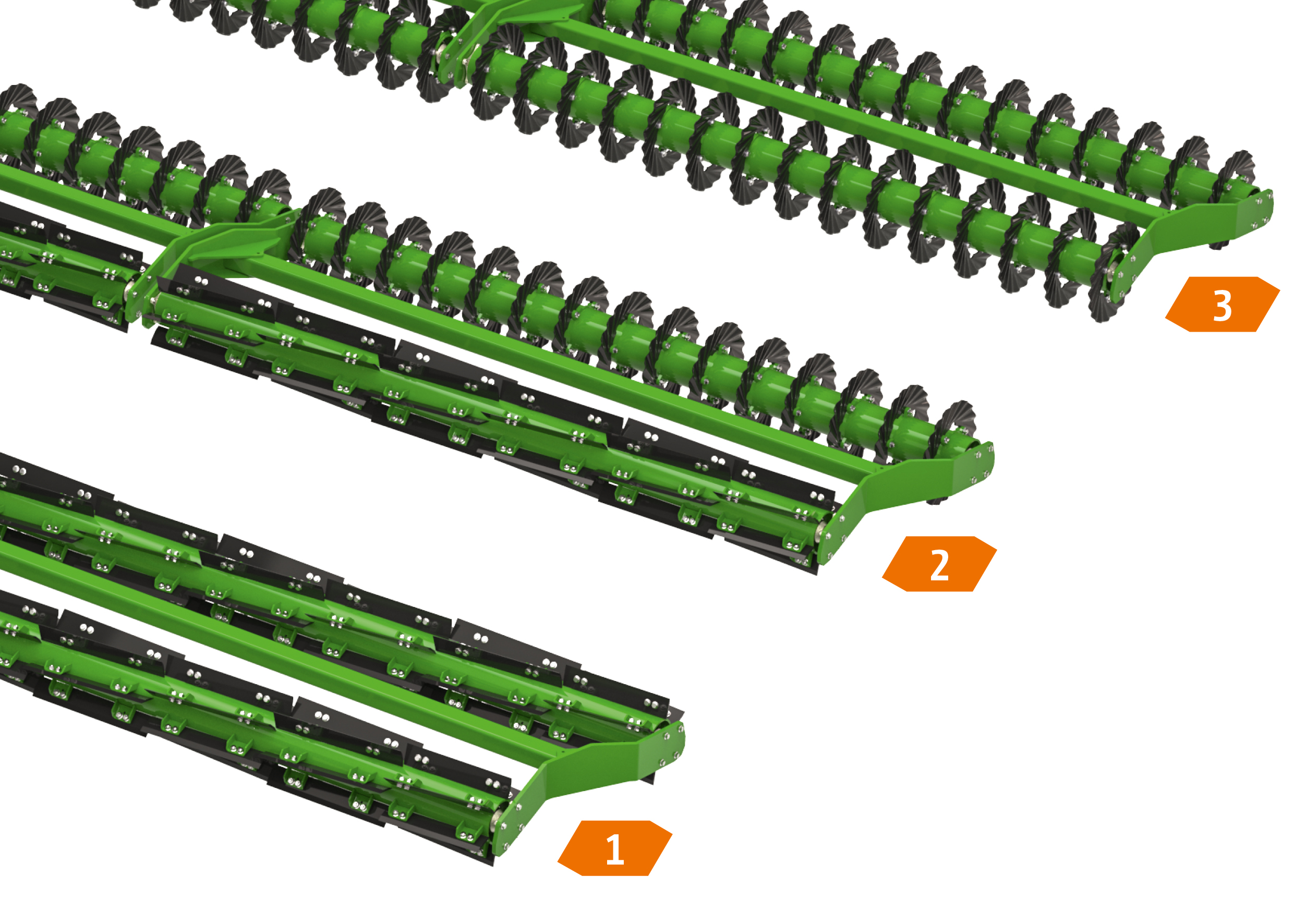 Um den steigenden Ansprüchen der ultraflachen Bodenbearbeitung gerecht zu werden hat AMAZONE die Schneidwalzenkombination Top Cut entwickelt. Diese besteht aus bis zu drei aufeinanderfolgenden Werkzeugsegmenten und einem Nachläufersegment, die je nach Kundenwunsch und Anforderung mit unterschiedlichen Werkzeugen bestückt werden können: