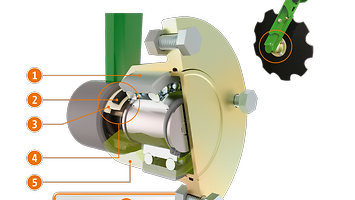 Die Scheibenlagerung mit zweireihigen Schrägkugellagern ist über eine Gleitringdichtung abgedichtet. Diese verhindert zuverlässig ein Eindringen von Fremdkörpern und ein austreten von Öl. Dank der Ölbadfüllung sind die Lager komplett wartungsfrei.