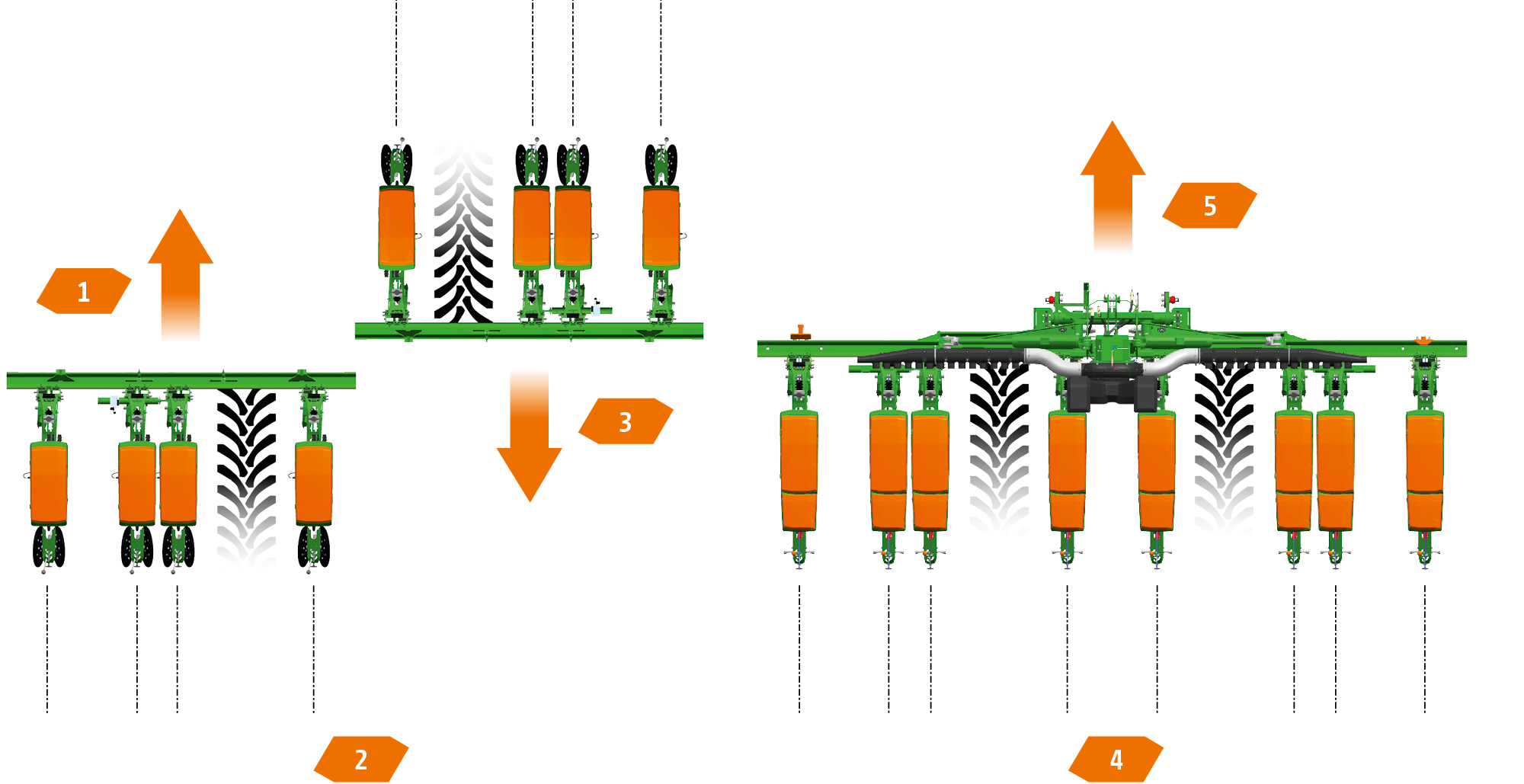 Bei symmetrischen Fahrgassen werden die relevanten Säaggregate gleichzeitig verschoben und die Fahrgassen in nur einer Überfahrt angelegt. Bei asymmetrischen Fahrgassen wird durch die Verschiebung des relevanten Säaggregats nur eine Spur je Überfahrt angelegt und die Fahrgasse in der zweiten Überfahrt vervollständigt. Der maximale Verschiebeweg eines Aggregats liegt bei 400 mm. Wird die gesamte Breite aufgrund von Spurweite oder Reifengröße nicht benötigt, kann der Verschiebeweg auch verringert werden.