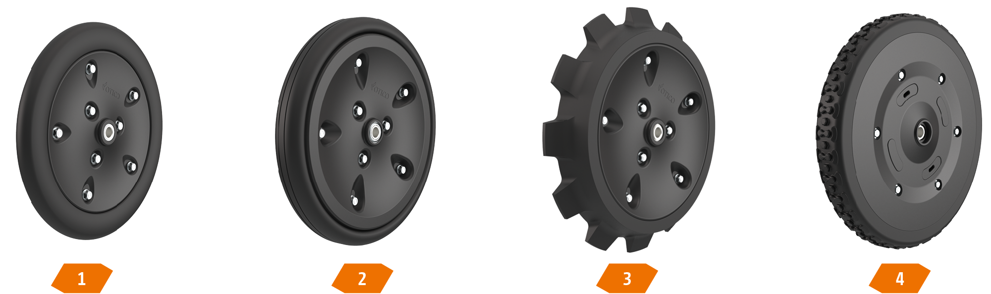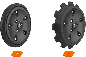 Die schmale Andruckrolle mit einer Breite von 25 mm ist ideal für mittlere bis schwere Böden geeignet, während die Andruckrolle mit einer Breite von 50 mm besser auf eher leichten Böden arbeitet. Für eine besonders gute Rückverfestigung und Krümelung empfiehlt sich der Einsatz der gezackten Andruckrolle der Breite 50 mm.