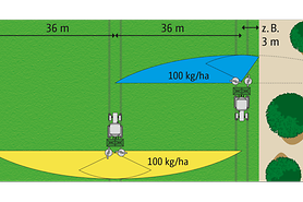 Befindet sich die erste Fahrgasse am Feldrand, wird das Grenzstreuen (umweltorientierte Einstellung) über eine halbseitige Abschaltung des Streufächers realisiert. Es gelangt kein Dünger über die Feldgrenze, im Feldinnern bleibt es bei einer optimalen Düngung.