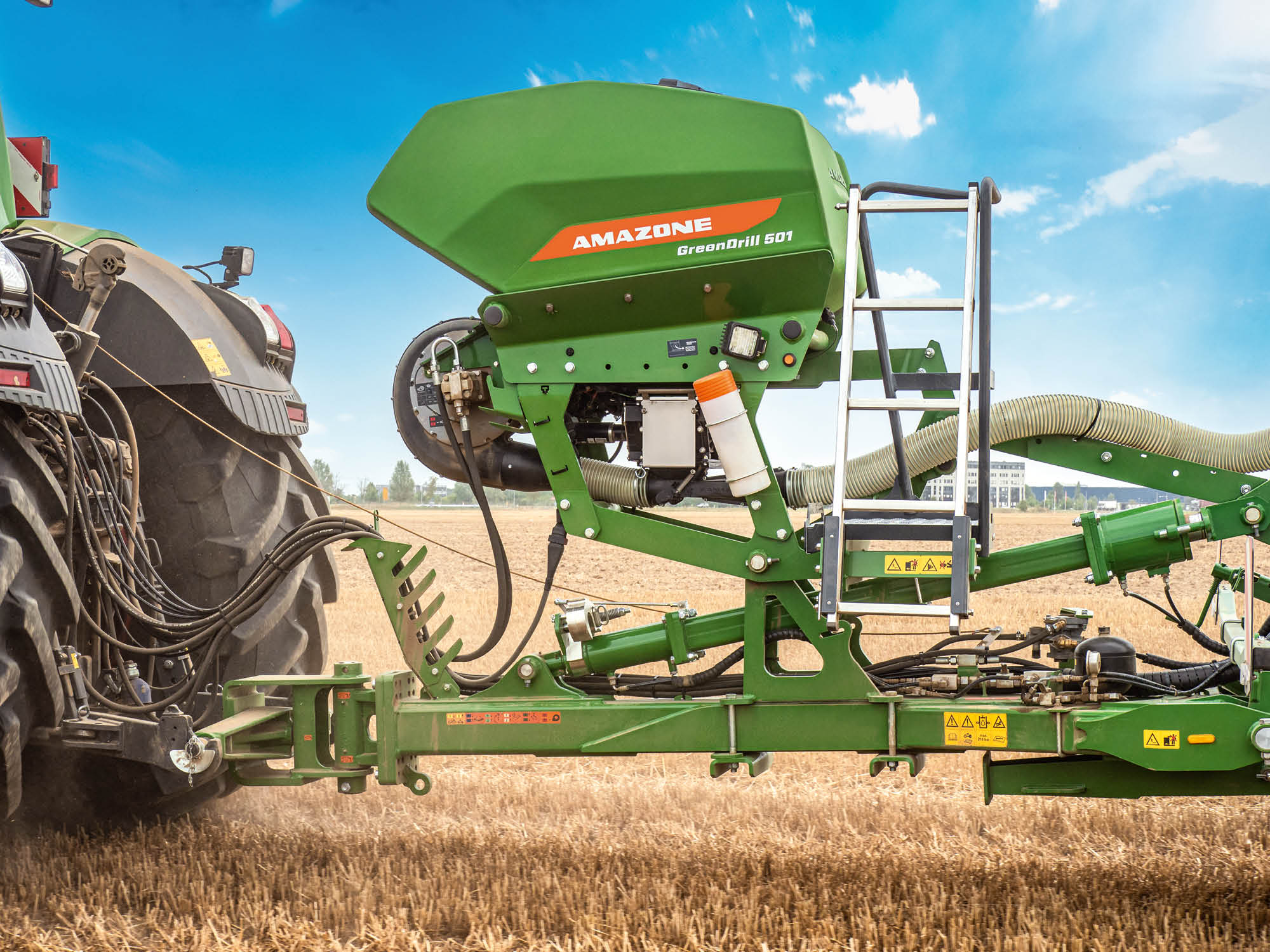 Damit Zwischenfrüchte direkt oder während der Bodenbearbeitung ausgebracht werden können, bietet AMAZONE den Heckaufbaubehälter GreenDrill 501 an, dessen Behälter 500 l fasst und sicher über Trittstufen zu erreichen ist.