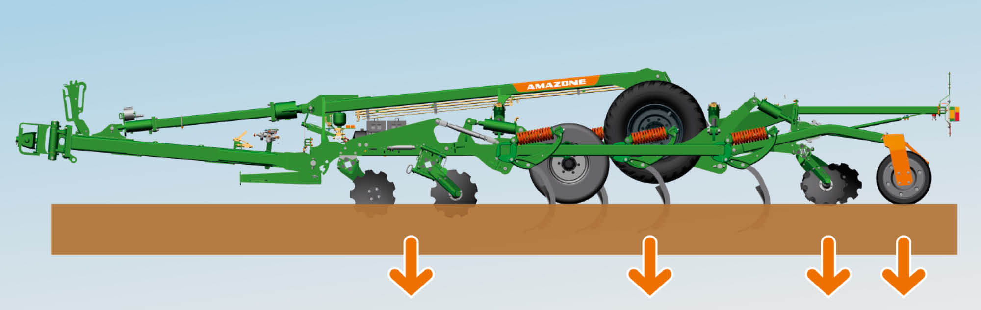- Für Einsätze bei denen nur tief gelockert werden soll, kann bei maximaler Arbeitstiefe des Zinkenfelds das Scheibenfeld so weit ausgehoben werden, dass es nicht mehr arbeitet.