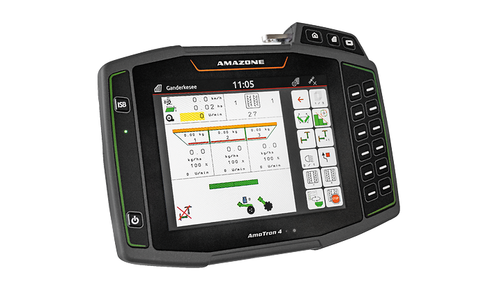 Für die Steuerung der Maschine steht der Bedien-Computer 5.2 zur Verfügung. Mit diesem lassen sich die Säwelle und das Gebläse schalten. Zusätzlich steht ein Auswahlmenü zur Unterstützung der Kalibrierung und zur Anzeige der Fahrgeschwindigkeit, der bearbeiteten Fläche und der Arbeitsstunden zur Verfügung. Die Säwellen-Drehzahl passt sich automatisch an wechselnde Fahrgeschwindigkeiten an, sobald der Bedien-Computer an die 7-polige Traktorsignal-Steckdose angeschlossen wird.