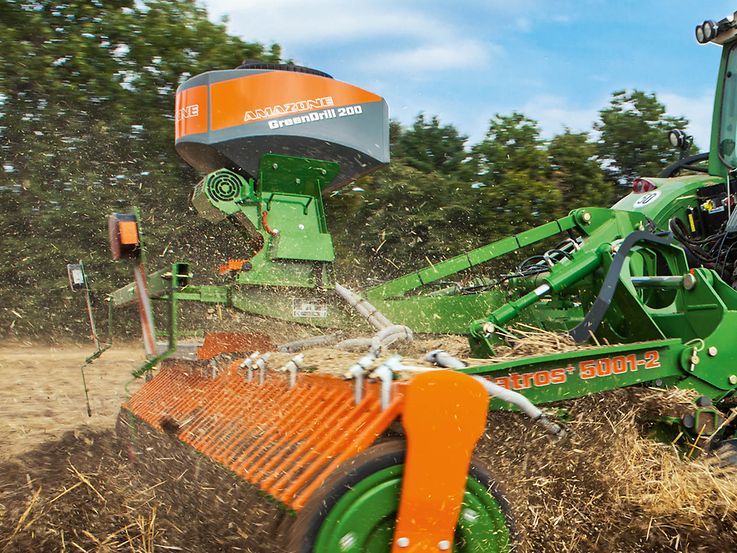 Damit Sie Zwischenfrüchte direkt oder zusammen mit der Bodenbearbeitung ausbringen können, bietet AMAZONE die Aufbausämaschine GreenDrill an. Sie lässt sich sowohl mit den Kompaktscheibeneggen Catros, CatrosXL und Certos als auch mit dem Mulchgrubber Cenius, dem Kreiselgrubber KG oder der Kreiselegge KE kombinieren. Die Verteilung des Saatguts erfolgt über Prallteller.