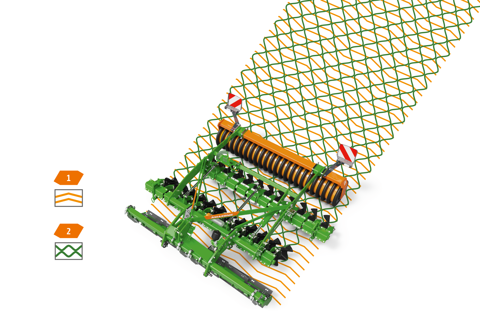 +-Scheiben und CatrosXL-Scheiben besonders steil angeordnet. Das sichert die fließende Übergabe des Boden-Organik-Gemisches von der ersten zur zweiten Scheibenreihe und führt zu einer erstklassigen Durchmischung von Erde und Pflanzenmaterial. Im Vergleich mit flach angestellten Scheiben ist der Abwurfwinkel bei steiler Scheibenanordnung deutlich kleiner. So wird das aufgewühlte Boden-Organik-Gemisch schon vor der Nachlaufwalze wieder richtig auf der Bodenoberfläche abgelegt.