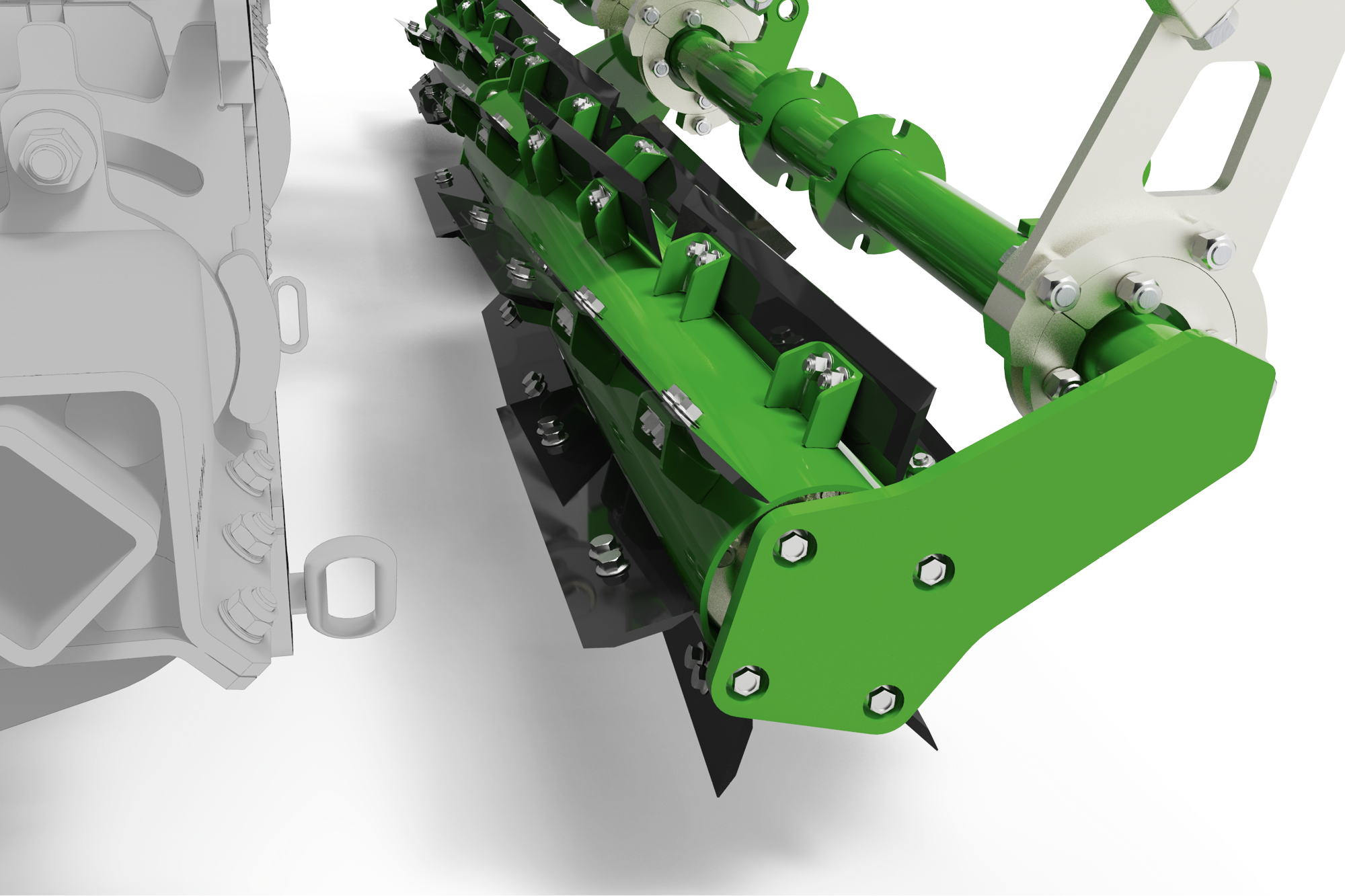 Während der Arbeit wird die Walze aus der Kabine heraus in Arbeitsstellung geschwenkt. Durch die Aufteilung in die verschiedenen Segmente kann die Walze der Bodenkontur auch in unebenem Gelände perfekt folgen und Erntereste auf der ganzen Arbeitsbreite sicher zerkleinern.