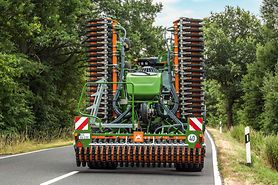Zur Grundausstattung der Anhängemaschinen Catros-2TX mit 7 m, 8 m und 9 m Arbeitsbreite gehört ein schwenkbares Mittelfahrwerk. Dieses zeichnet sich durch eine hohe Laufruhe aus, weil das Gewicht des Fahrwerks gleichmäßig auf Scheibenfeld und die Nachlaufwalzen drückt. Aufgrund des Mittelfahrwerks sind die Catros-2TX-Maschinen sehr wendig.