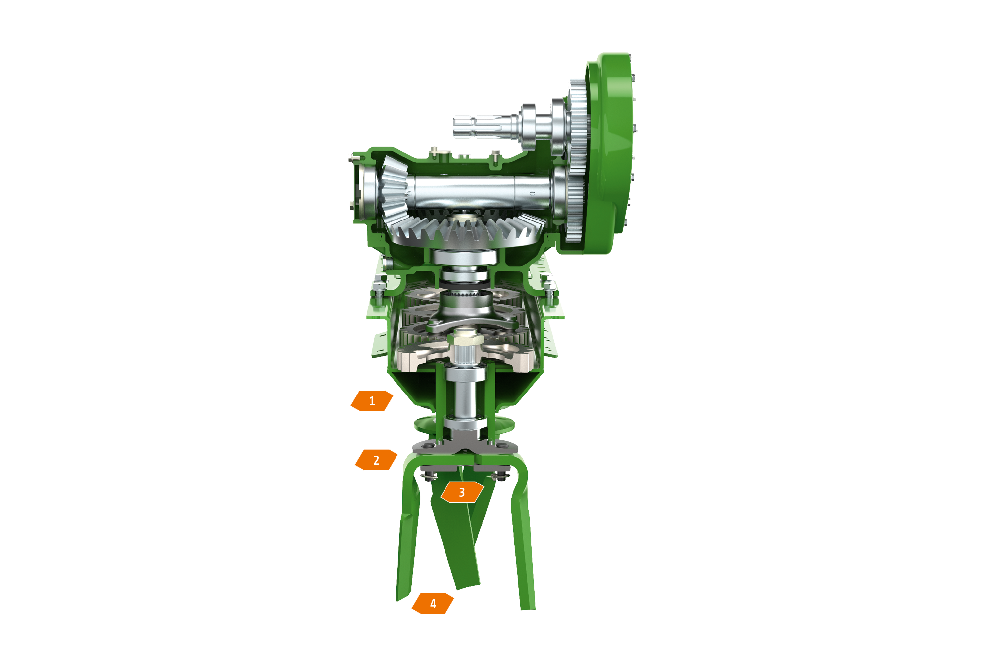 Kernstück der neuen KE 02 ist das Getriebe DirectDrive, über das der höhere Kraftfluss direkt auf die Stirnräder der Kreiseleggenzinken übertragen wird. Wie auch bei den Kreiselgrubbern KX und KG findet keine Umlenkung statt, damit ist eine sehr gute verschleißarme Kraftübertragung gewährleistet. Bei der geklappten KE 02-2 befindet sich das Getriebe jeweils auf beiden Auslegern. Die Kreiselegge kann mit Zapfwellen-Drehzahlen 540/750/1.000 eingesetzt werden. Wechsel-Zahnradsätze für andere Geschwindigkeitsdrehzahlen sind möglich. Höhere Drehzahlen sorgen für bessere Krümelleistung.