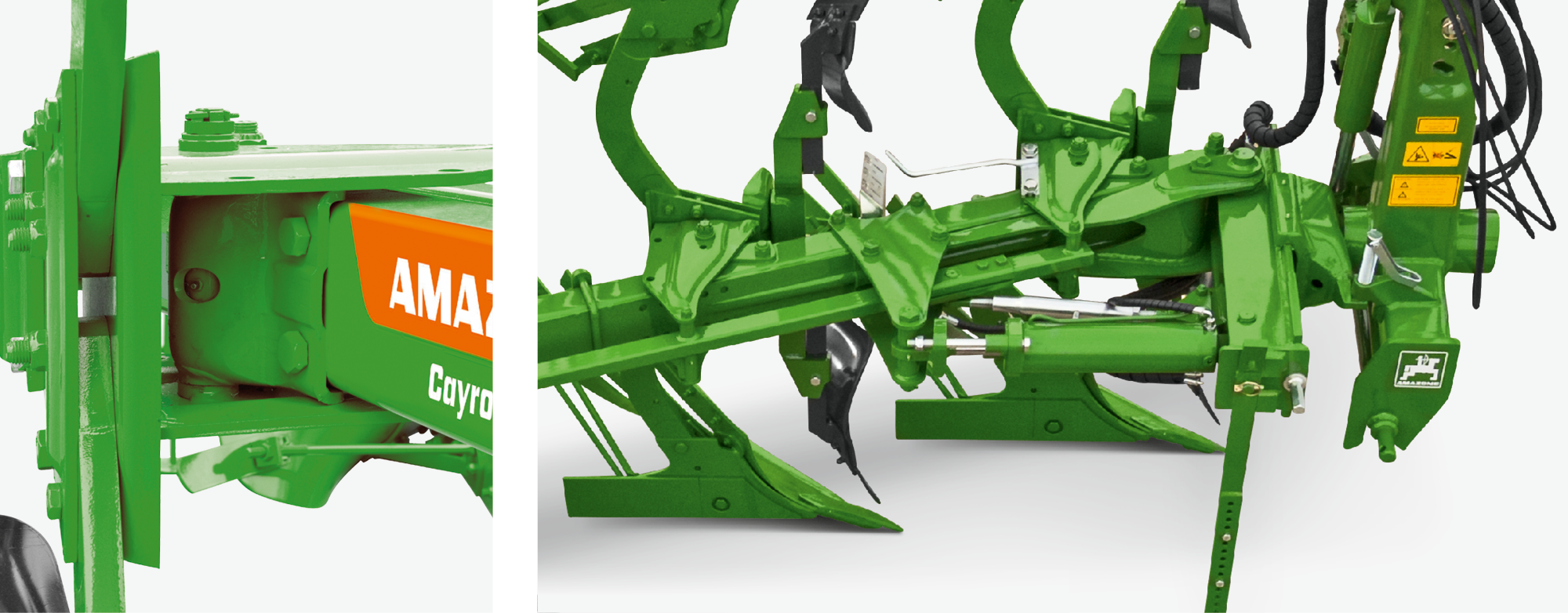 Bei allen Cayros-V-Pflügen erfolgt die Einstellung der Arbeitsbreite stufenlos und hydraulisch vom Traktor aus. Eine sehr gut sichtbare Anzeige, bestehend aus Skala und Zeiger, informiert den Fahrer über die eingestellte Arbeitsbreite. Durch die integrierte Kinematik des Cayros V werden auch der Zugpunkt, die Arbeitsbreite des ersten Körpers, sämtliche Vorwerkzeuge und das Stützrad automatisch mit eingestellt.