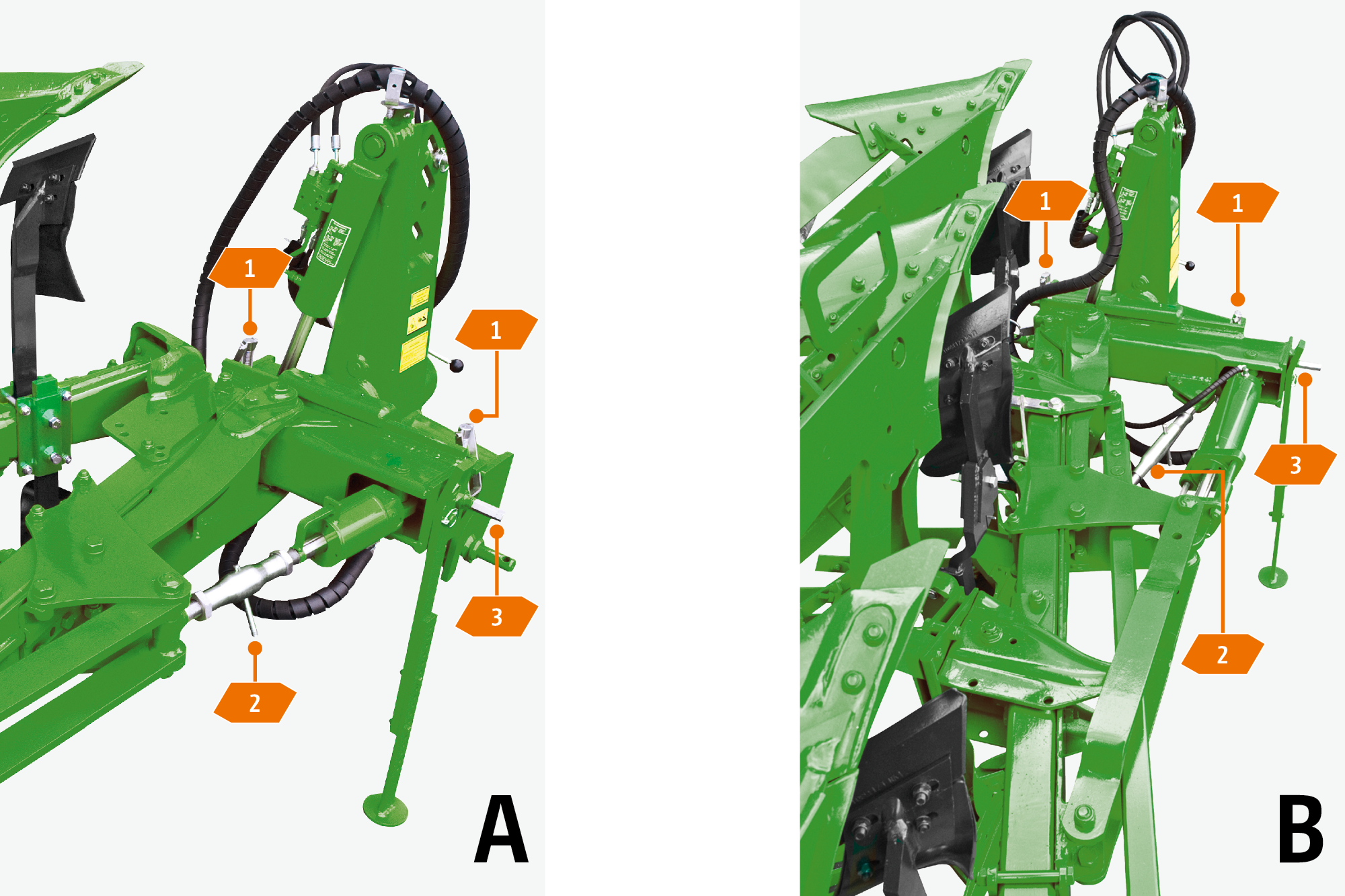 Optional ist die Anpassung der Erstkörper-Arbeitsbreite direkt von der Traktorkabine aus mittels doppelwirkendem Hydraulikzylinder verfügbar. Diese bietet einen hohen Einstellkomfort, insbesondere in Hanglagen, bei stark wechselnden Böden oder bei häufigem Traktorwechsel.