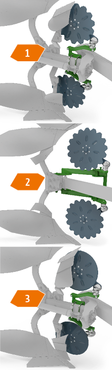 Diese sorgen für mehr Platz zwischen dem Sech und Vorschälern. Zusätzlich kann das Scheibensech unabhängig vom Pflugkörper Hindernissen ausweichen.
