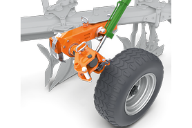 Für einfaches Umstellen zwischen Transportstellung und Arbeitsstellung ist das mechanisch oder hydraulisch einstellbare Kombirad verfügbar, das für grenznahes Pflügen seitlich am Teres verbaut ist.