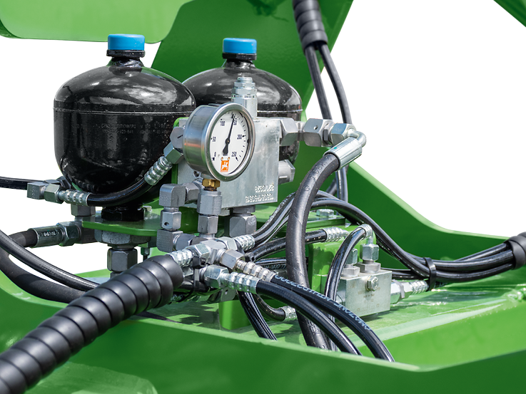 Die 2 Seitenrahmen des TopCuts werden für eine bessere Anpassung an den Boden mit dem System ContourFrame hydraulisch vorgespannt. So wird die optimale Anpassung an die Kontur eines hügeligen Geländes ermöglicht.