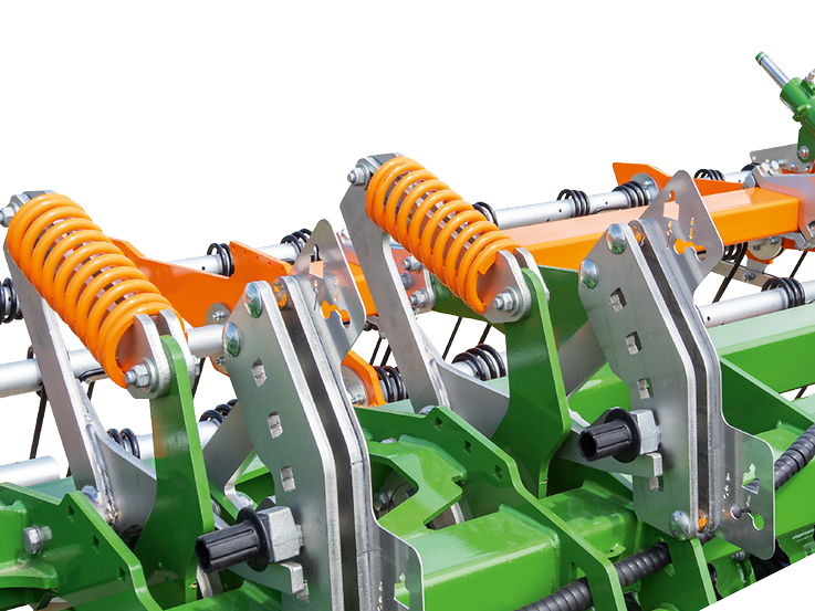 Je Seitenrahmen sind je 2 Werkzeugsegmente mit einer Breite von je 3 m verbaut, welche einzeln in der Höhe verstellbar sind. Die Arbeitstiefe jedes Segments lässt sich separat einstellen. Dazu werden die mit Druckfedern vorgespannten Werkzeuge über Excenterbolzen verstellt. Das Federsystem passt das Höhenverhältnis und Druckverhältnis zwischen Hauptwerkzeug und Nachläufer an.