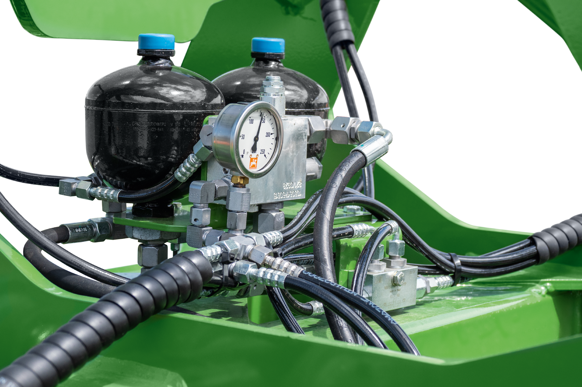 Die 2 Seitenrahmen des TopCuts werden für eine bessere Anpassung an den Boden mit dem System ContourFrame hydraulisch vorgespannt. So wird die optimale Anpassung an die Kontur eines hügeligen Geländes ermöglicht.