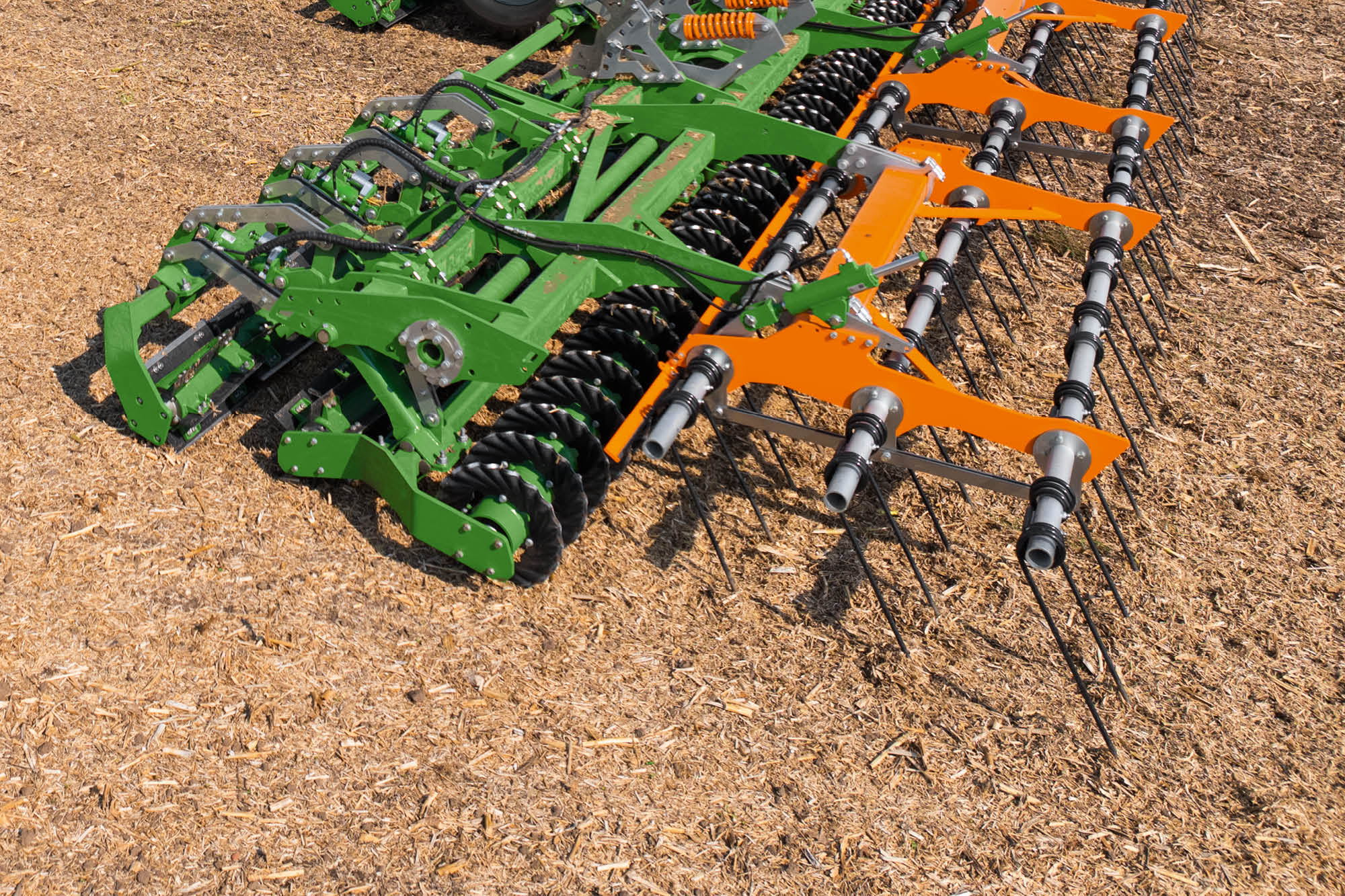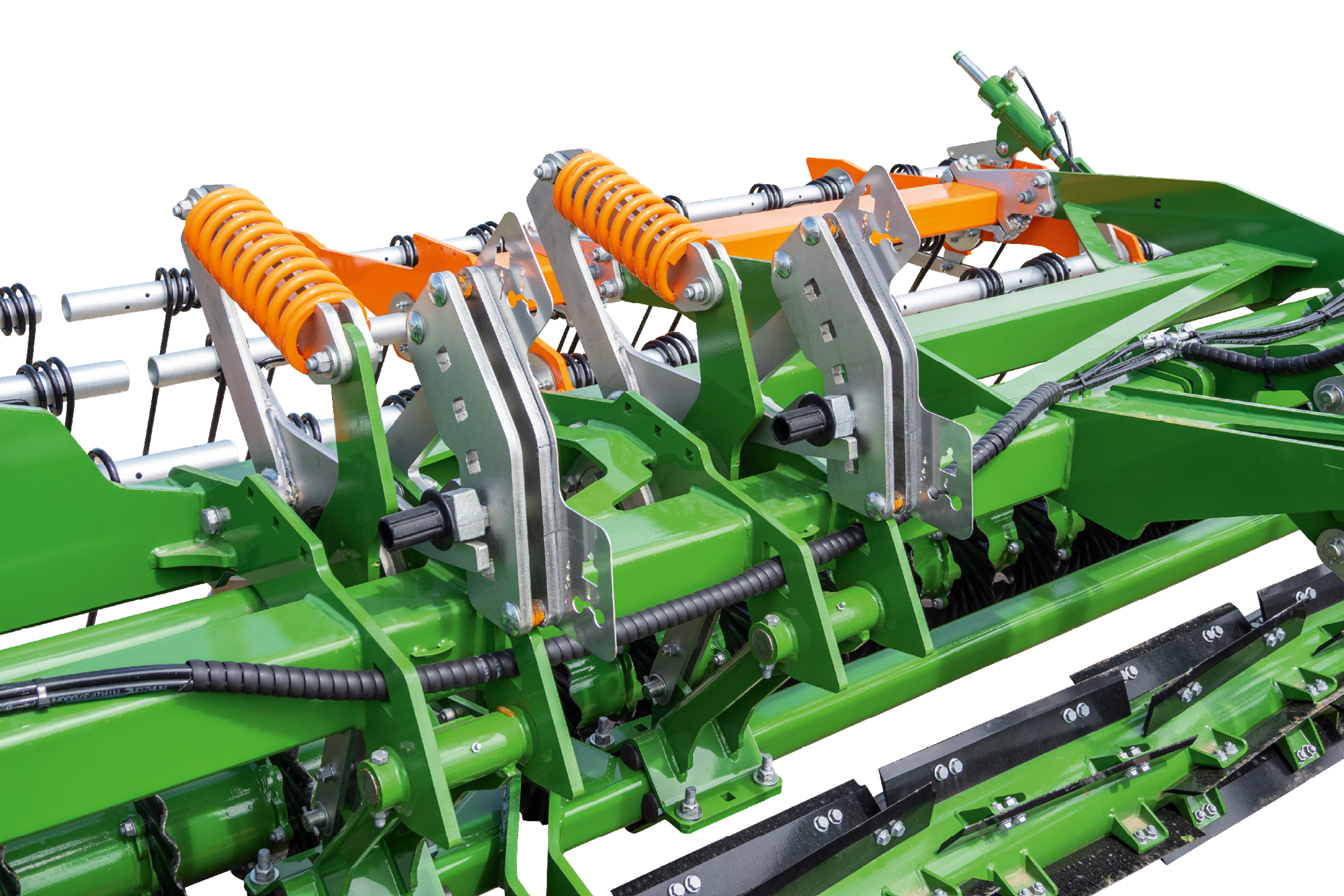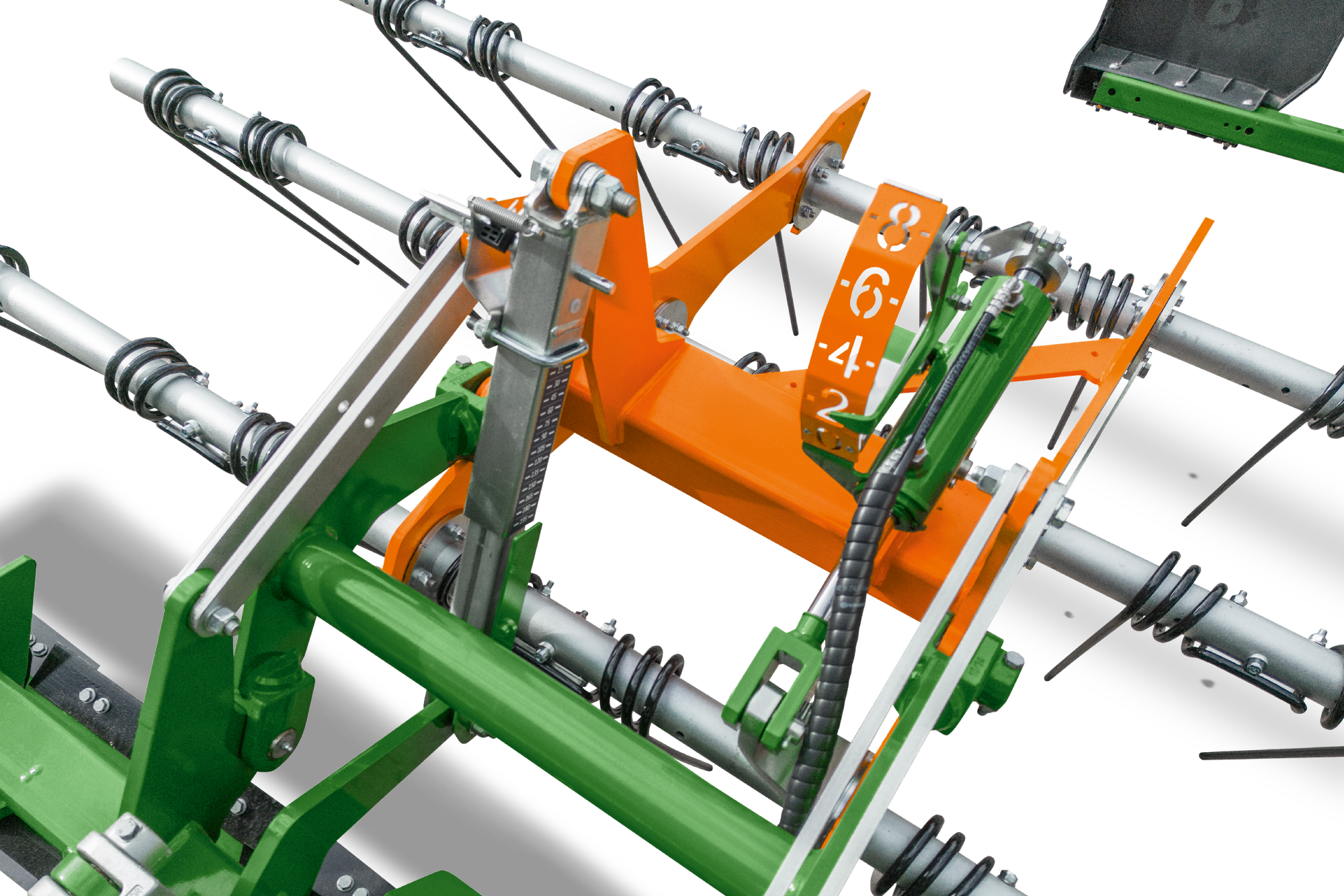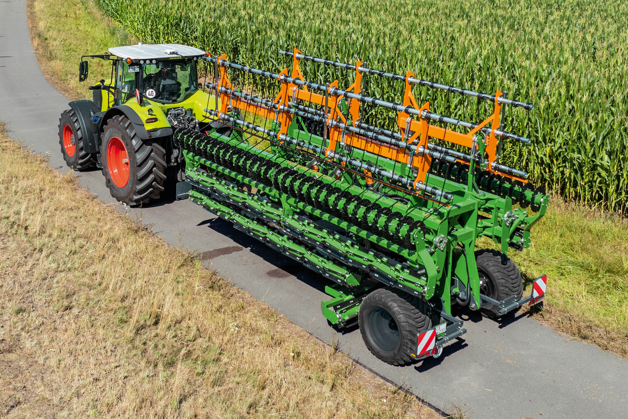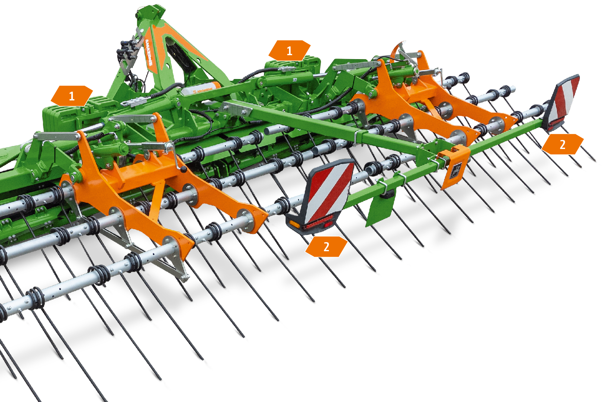 Die zweiteilige Klappung ermöglicht einen schnellen Wechsel zwischen den Feldern. Für den Straßentransport sind Verkehrssicherungsleisten an den Striegelzinken anzubringen.