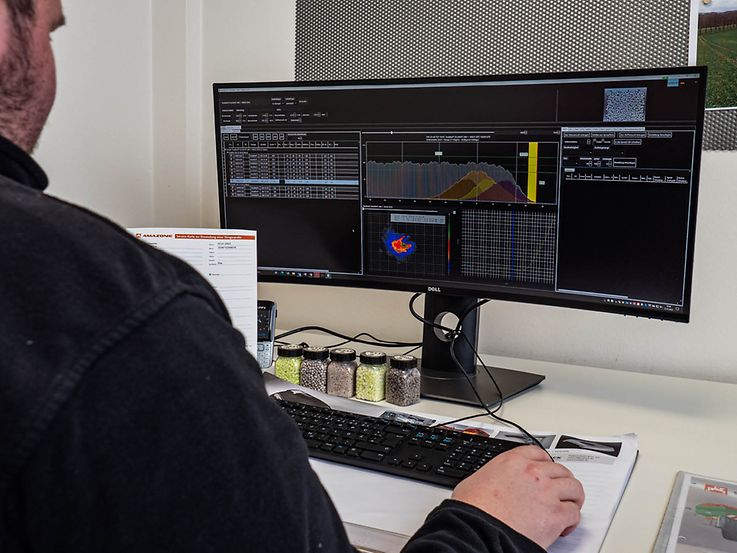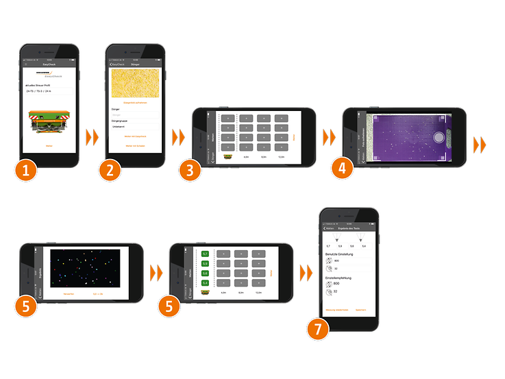 Statt der Prüfschalen, wie beim klassischen mobilen Prüfstand, besteht EasyCheck nur noch aus 16 leichten Prüfmatten aus Gummi und der EasyCheck-App für Smartphones. Die Prüfmatten werden in bestimmten Abständen zur Fahrgasse ausgelegt. Anschließend werden die entsprechenden Fahrgassen abgestreut und dann die Matten mit den aufgefangenen Düngerkörnern per Smartphone fotografiert. Die App vergleicht nun automatisch, wie viel Dünger in den einzelnen Prüfmatten aufgefangen wurde und setzt die Ergebnisse der einzelnen Reihen in ein Verhältnis. Sollte das Streuergebnis nicht optimal sein, schlägt die App entsprechende Korrekturen für die Einstellung des jeweiligen Düngerstreuers vor.