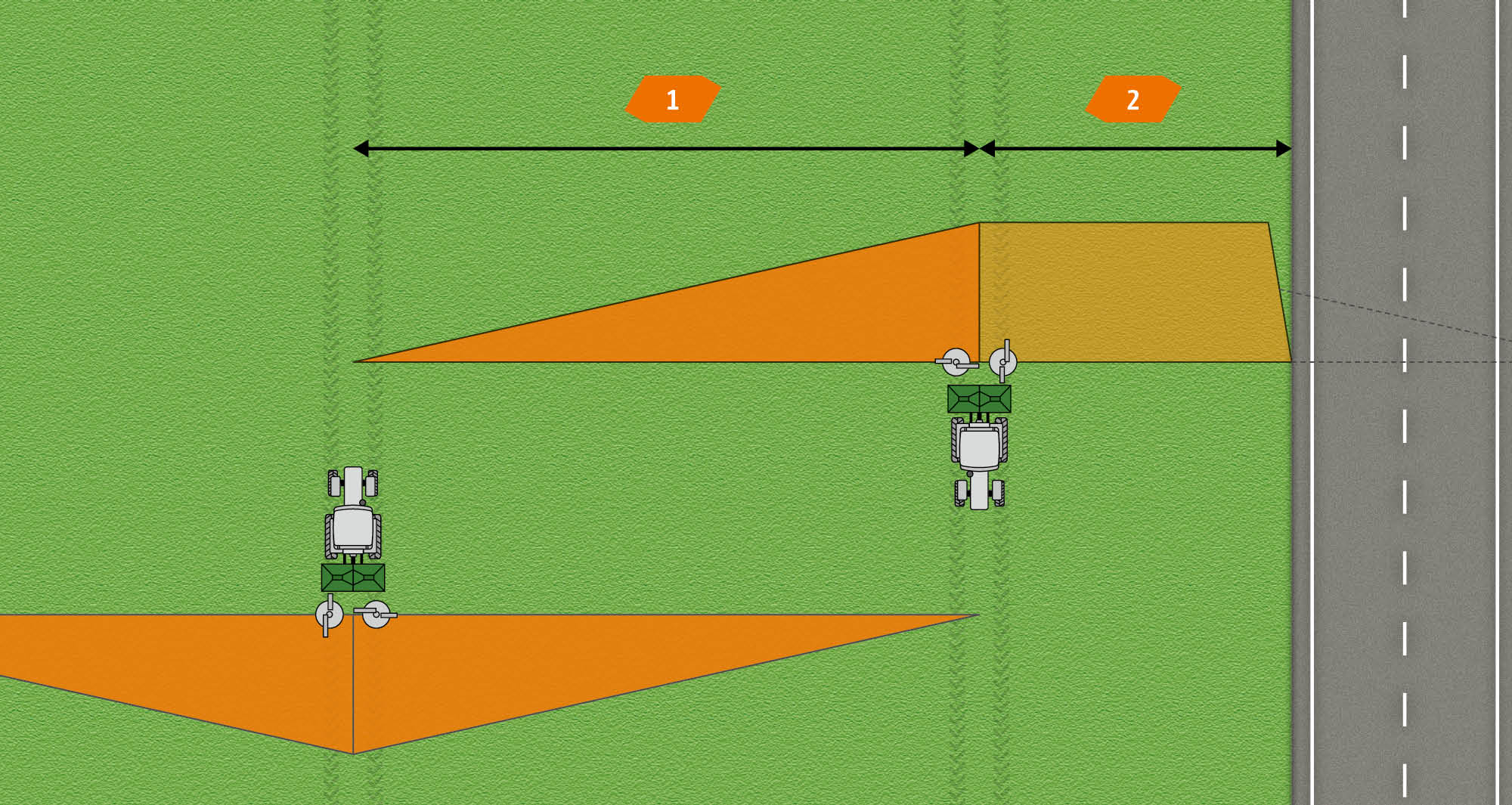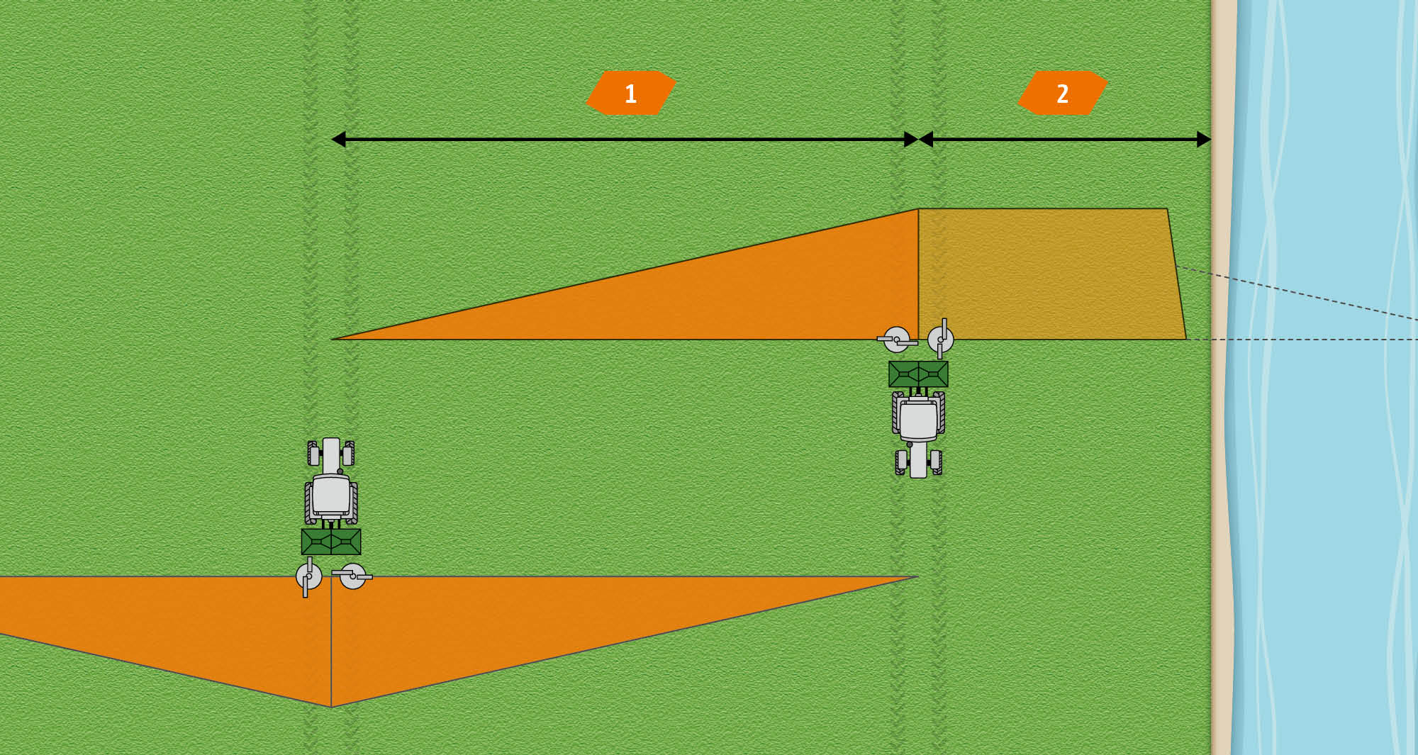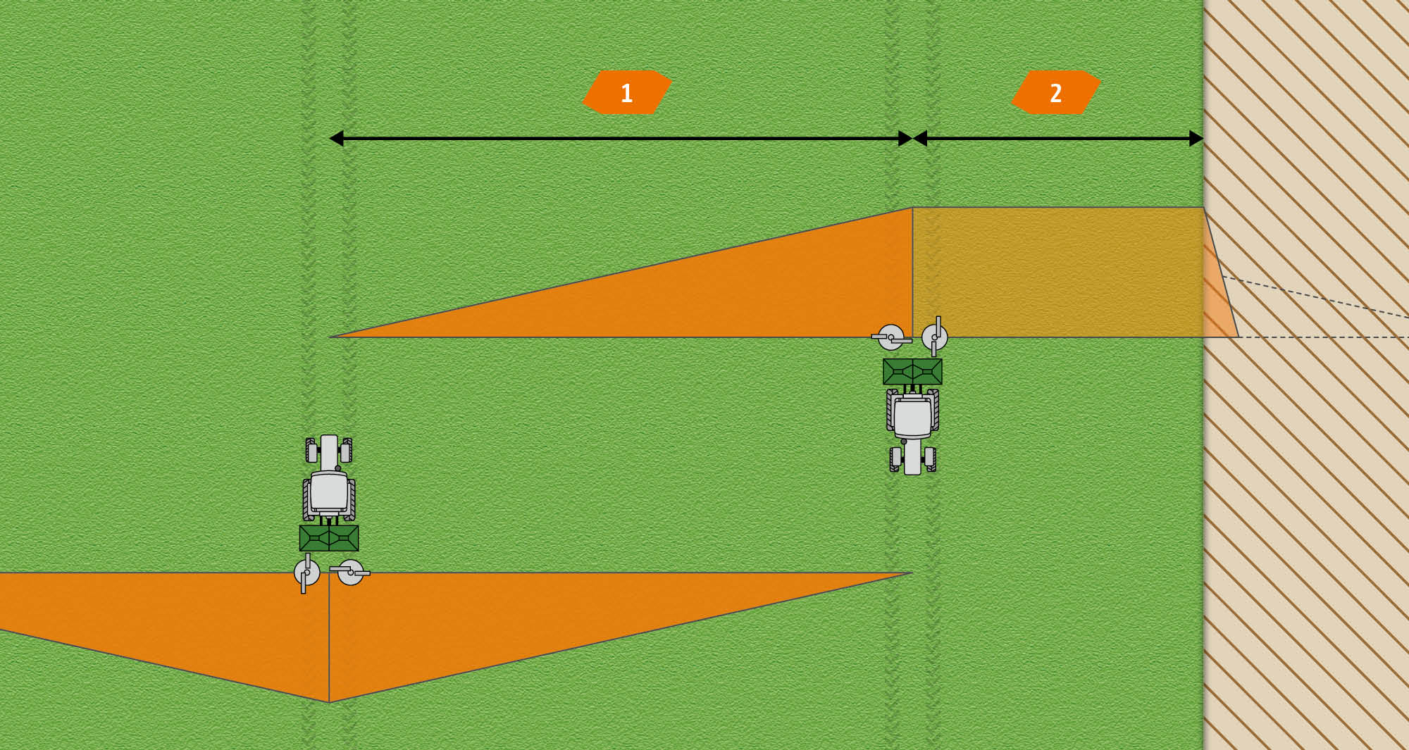 Der angrenzende Schlag ist eine landwirtschaftlich genutzte Fläche. Hier kann es toleriert werden, dass eine geringe Menge des Düngers über die Feldgrenze geworfen wird. Die volle Sollmenge wird bis an die Feldgrenze ausgebracht.