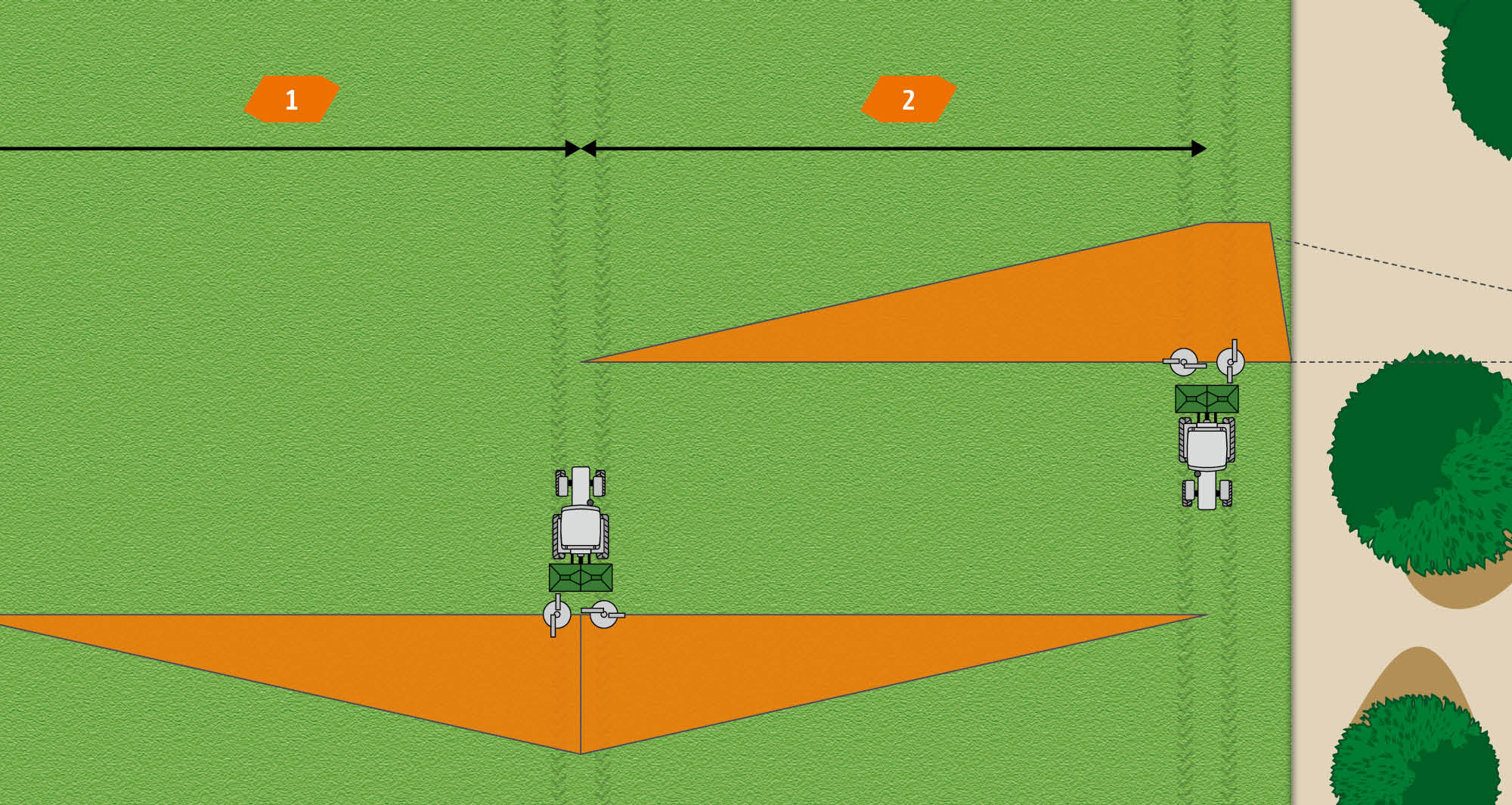 Befindet sich die erste Fahrgasse am Feldrand, wird das Grenzstreuen (umweltorientierte Einstellung) über eine halbseitige Abschaltung des Streufächers realisiert. Es gelangt kein Dünger über die Feldgrenze, im Feldinnern bleibt es bei einer optimalen Düngung.
