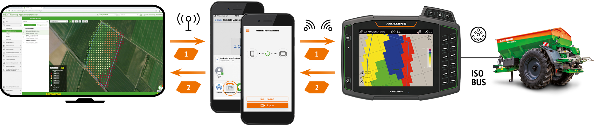 • Mit App AmaTron Share bequem Aufträge im ISO-XML-Format oder shape-Format importieren und bearbeitete Aufträgen im ISO-XML-Format oder als Auftragszusammenfassung im PDF-Format exportieren