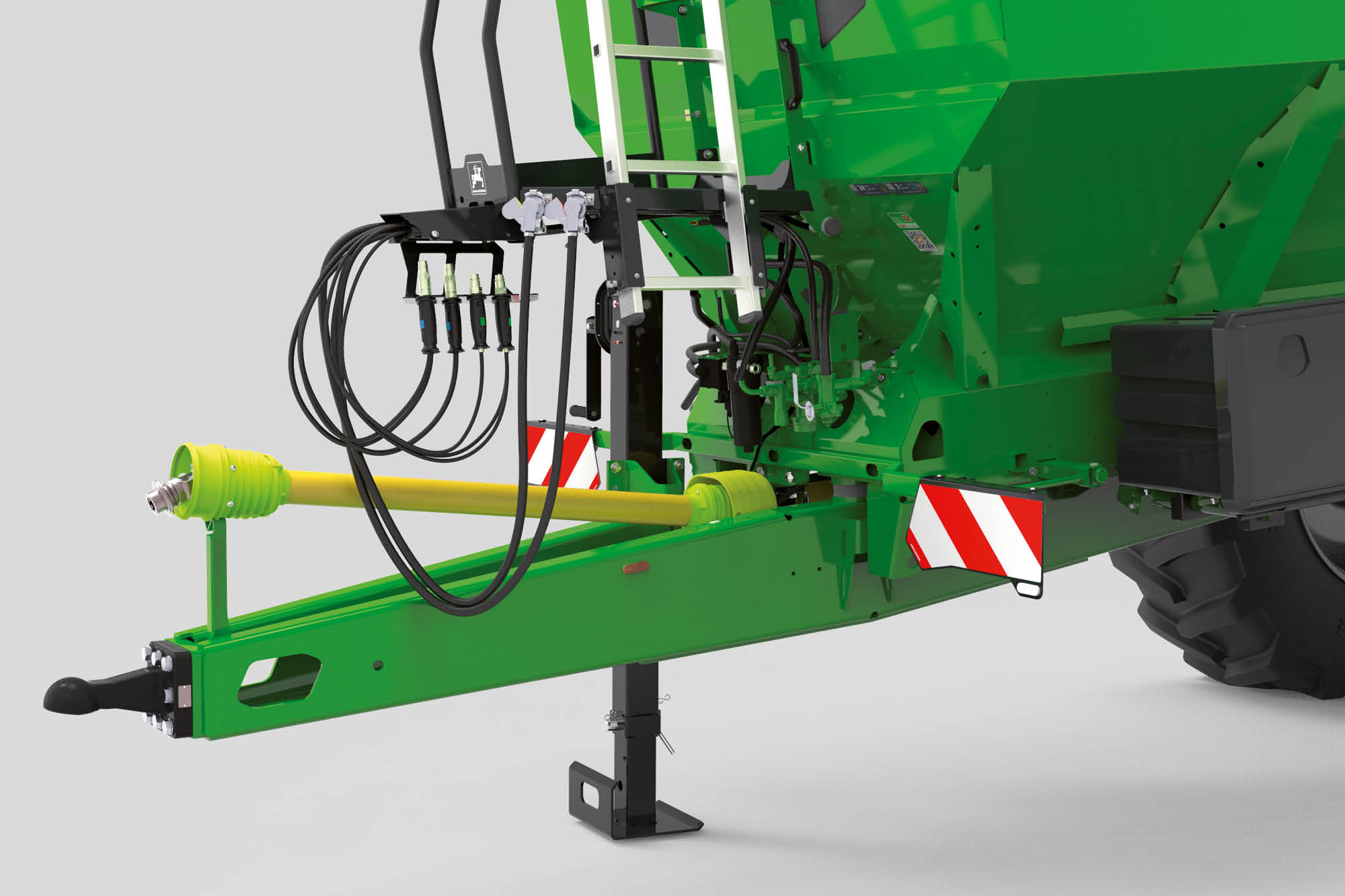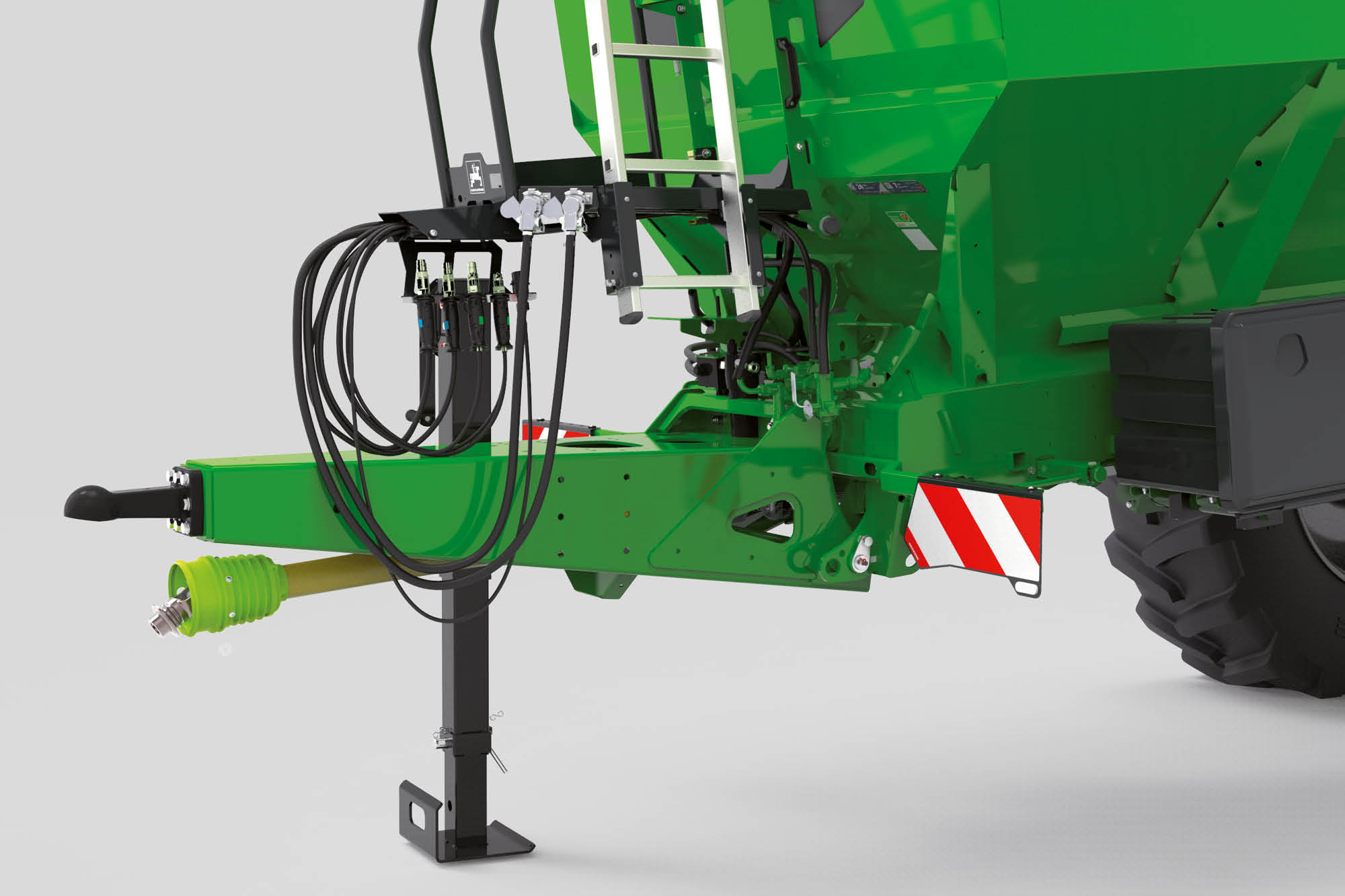 Der um 5 Grad ansteigende Bandboden sorgt für eine Entladung von hinten nach vorn. Dies garantiert eine optimale Lastverteilung während des Streuens. Maximale Stützlast und geringere Achslasten ermöglichen ein sicheres Befahren des Felds unter allen Einsatzbedingungen.