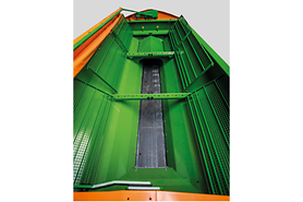 Der um 5 Grad ansteigende Bandboden sorgt für eine Entladung von hinten nach vorn. Dies garantiert eine optimale Lastverteilung während des Streuens. Maximale Stützlast und geringere Achslasten ermöglichen ein sicheres Befahren des Felds unter allen Einsatzbedingungen.