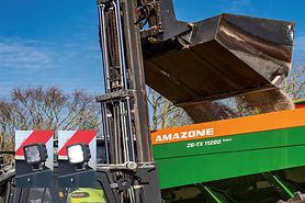 Um möglichst schnell mit der Beladung zu beginnen, wird die Abdeckrollplane hydraulisch fernbedient. Die sehr große Behälteröffnung bei geöffneter Abdeckrollplane ermöglicht es, den Streuer auch mit großen Schaufeln zu beladen. Die am Behälterrand fixierte Plane lässt außerdem kein Durchdringen von Dünger oder Kalk zwischen Plane und Behälter zu.