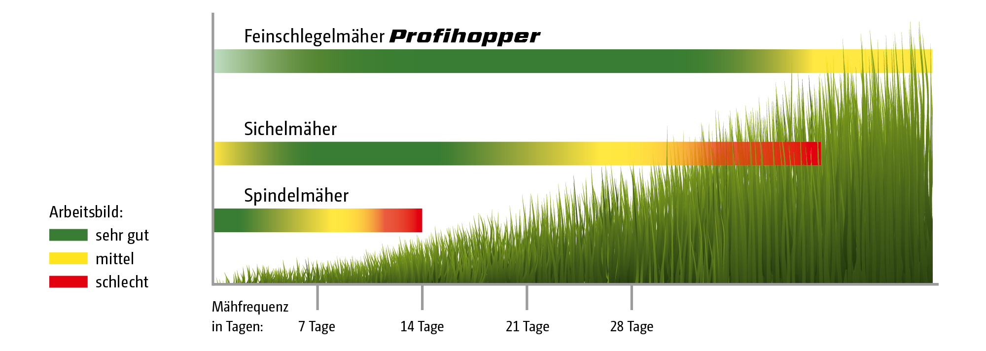 Im Vergleich zum Sichelmäher und dem Spindelmäher arbeitet der Profihopper als Feinschlegelmäher technisch bedingt auch bei deutlich höheren Schnitthöhen sehr zuverlässig. Sowohl im kurzen als auch im langen Gras liefert der Profihopper ein ausgezeichnetes Schnittbild ab – bei nahezu allen Witterungs- und Vegetationsbedingungen.
