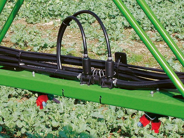 Beim Abschalten einzelner Teilbreiten, bei Wendevorgängen oder während des Transports bleibt die Spritzflüssigkeit dank der Druckregelung kontinuierlich in Zirkulation. So lassen sich Ablagerungen, Verstopfungen oder Entmischungen in den Spritzleitungen sicher verhindern.