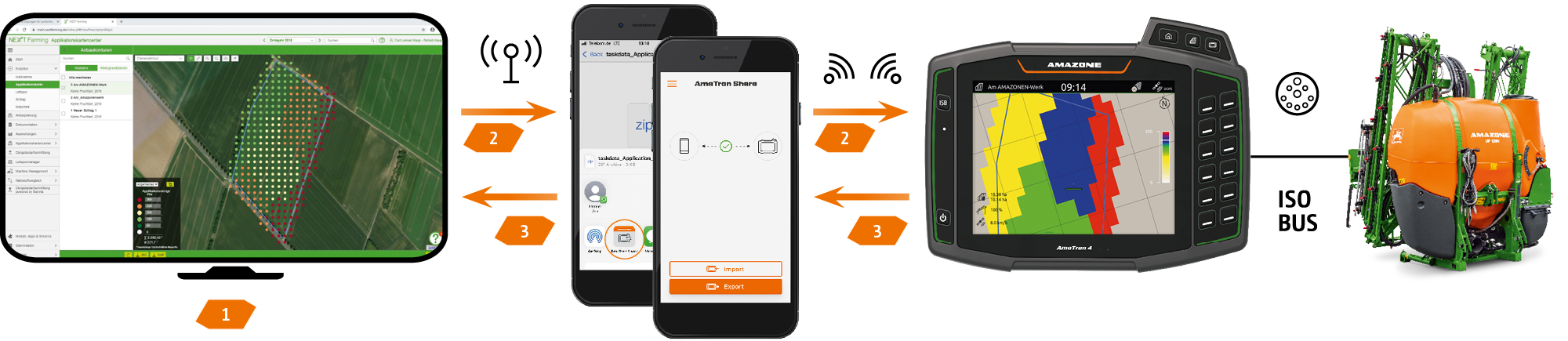 Über die App AmaTron Share, die über WLAN mit dem AmaTron 4 verbunden ist, können alle Daten bequem online übertragen werden. So können mit der App z. B. Applikationskarten einfach vom Büro auf das AmaTron 4 geschickt und abgearbeitet werden. Ebenso können Auftragsdaten nach der Arbeit als PDF-Dokumentation per Cloud, E-Mail oder Messenger-Diensten wie WhatsApp an die Kunden oder zurück ins Büro geschickt werden. Das ist komfortables Datenmanagement.