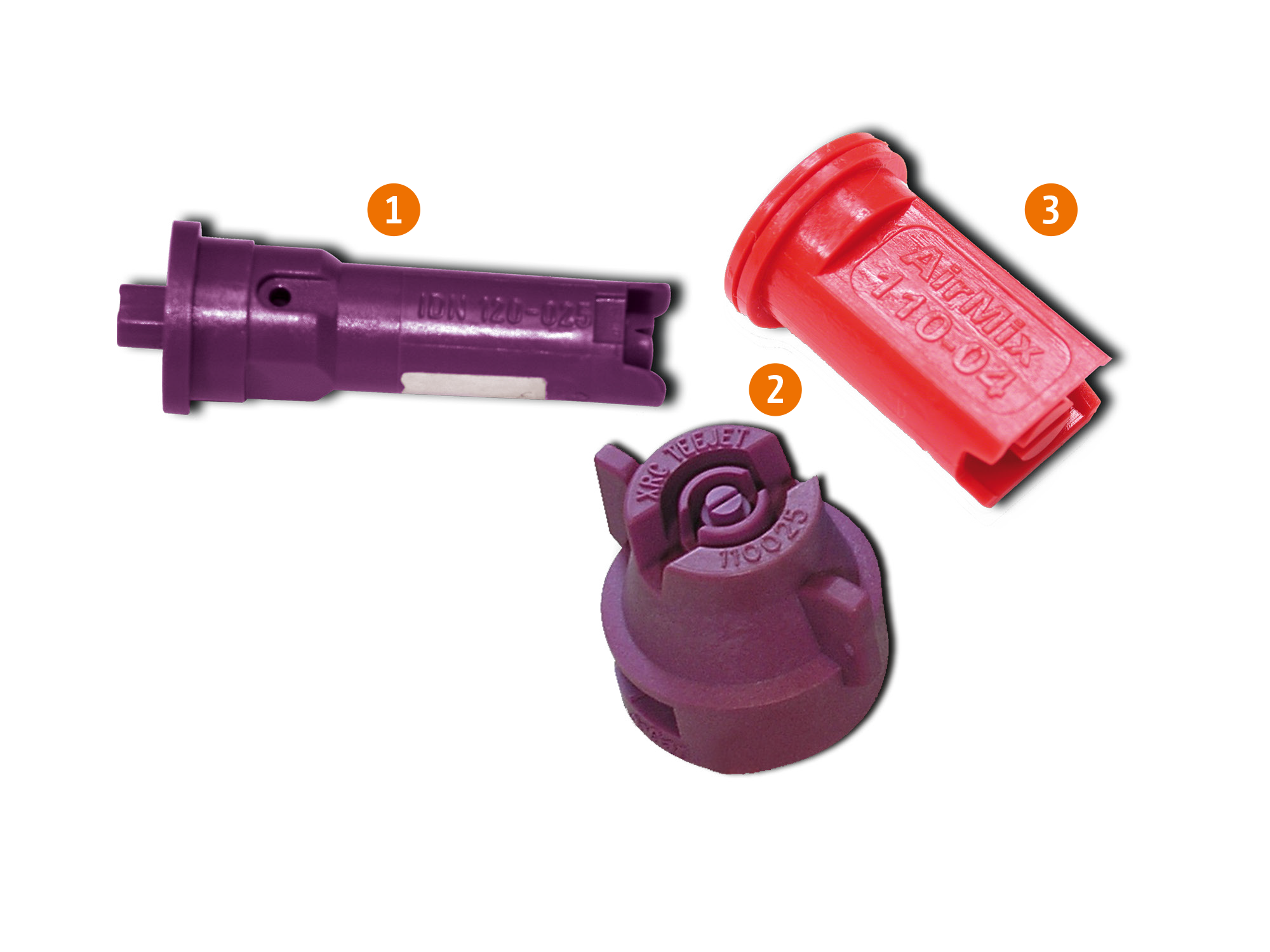 Beispiele: 1. Lechler IDN 120-025, 2. TeeJet XRC 110-025, 3. Injektor-Flachstrahldüse AirMix 110-04
