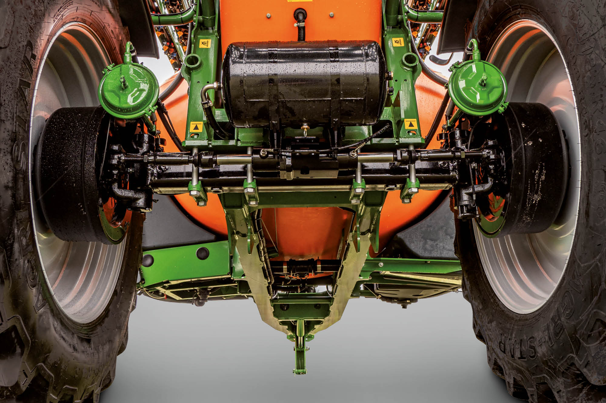 Die aktiv gefederte Achse sorgt für eine perfekte Federung der Maschine. Auf der Straße überzeugt sie durch sehr ruhiges Fahrverhalten. Auch auf dem Acker werden z.B. tiefe Fahrspuren optimal ausgeglichen. Für Betriebe, die ein besonderes Augenmerk auf die Schonung ihrer Maschine legen, ist diese Federung besonders gut geeignet.