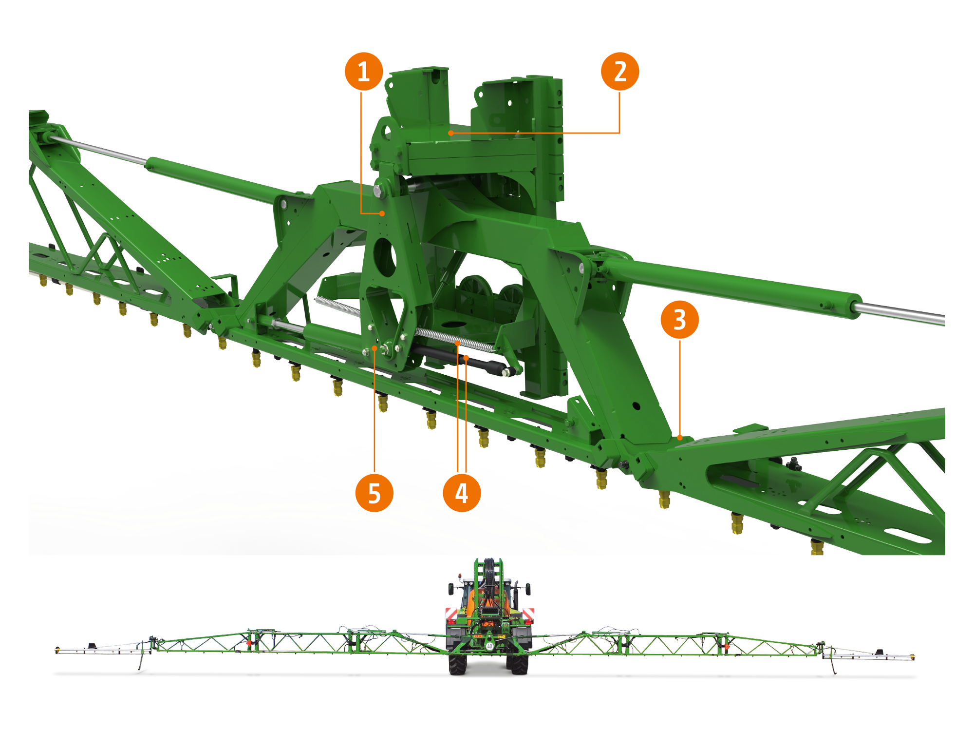 Mit den ebenfalls serienmäßigen Komponenten hydraulische Höhenverstellung und Abstandskufe ergibt sich eine exakte Längs- und Querverteilung der Spritzflüssigkeit.