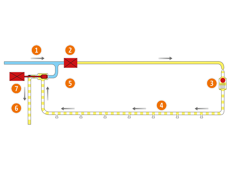 Das AMAZONE Druck-Umlauf-System DUS garantiert eine sichere Zirkulation im gesamten System. Bei Beginn der Arbeit wird das Leitungssystem einschließlich der Spritzleitung zunächst mit der Wirkstofflösung unter Druck und in entgegengesetzter Richtung geflutet. So sind die Spritzleitungen immer gefüllt und über die gesamte Arbeitsbreite sofort einsatzbereit. Wartezeiten am Vorgewende entfallen.