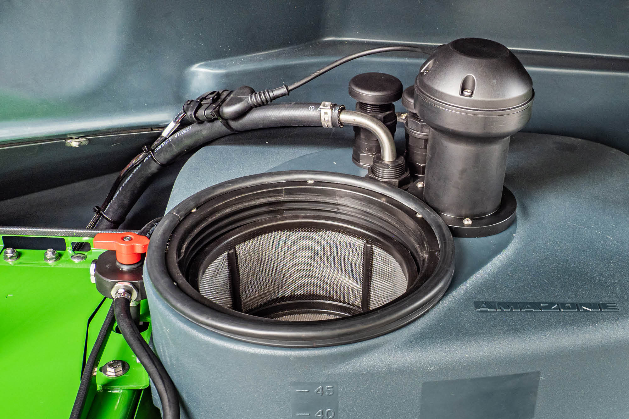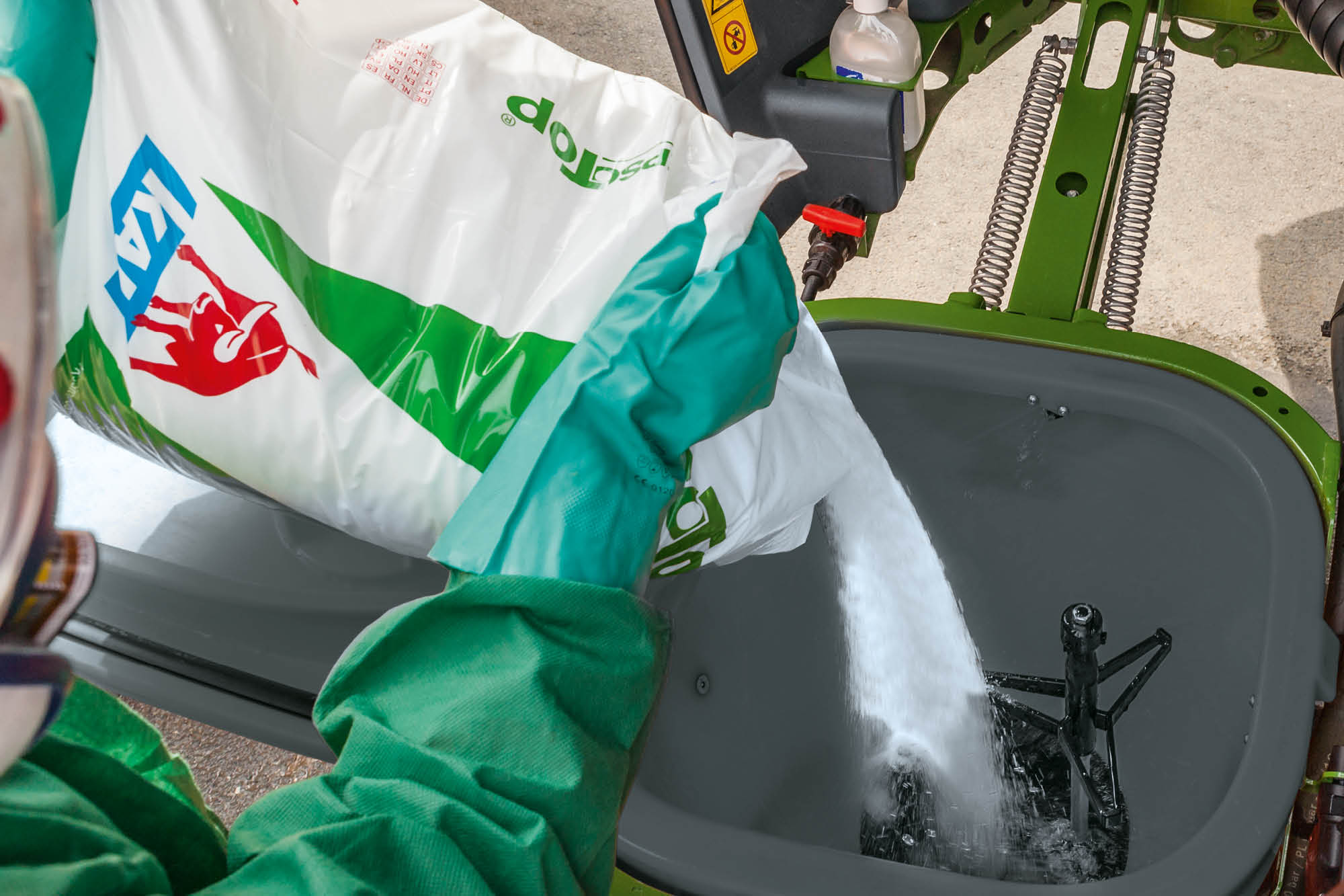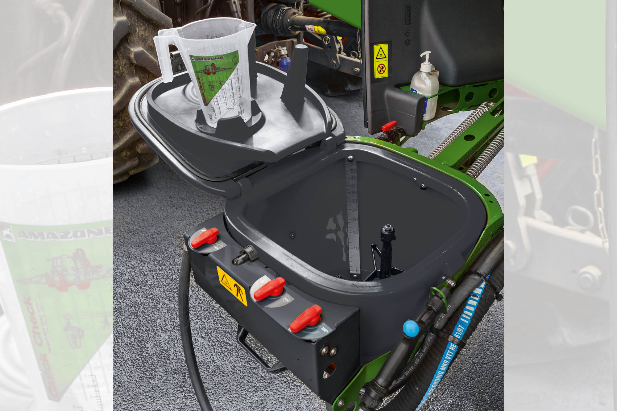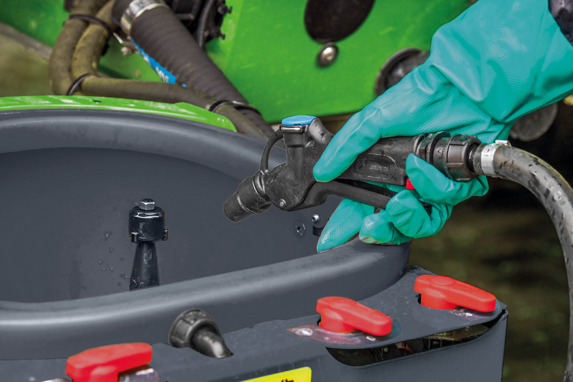 Im Job-Rechner können zwei individuelle Befüllprofile für unterschiedliche Bediener oder Anwendungen hinterlegt werden. Zum Befüllen muss dann nur noch der Schlauch angekuppelt werden, und die Maschine füllt den Spritzflüssigkeitstank und den Spülwassertank automatisch bis zum jeweils gewünschten Tankfüllstand. Optional kann der Anwender eine individuell einstellbare Befüllpause für den Spritzflüssigkeitstank wählen.